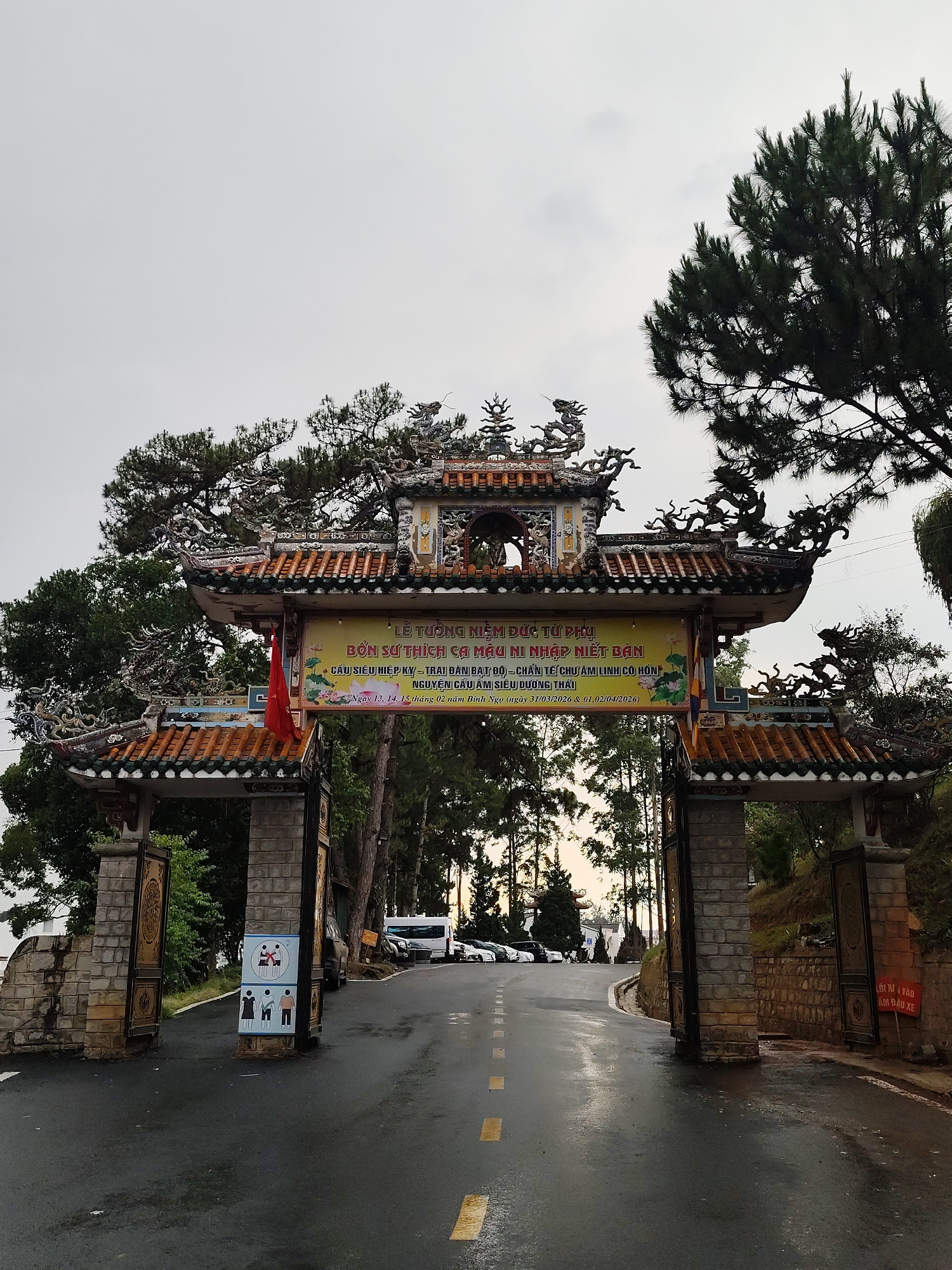 The image captures the entrance to the Truc Lam Zen Monastery in Da Lat, Vietnam. The gateway is a traditional Vietnamese architectural structure with an ornate tiled roof, stone pillars, and intricat…read more