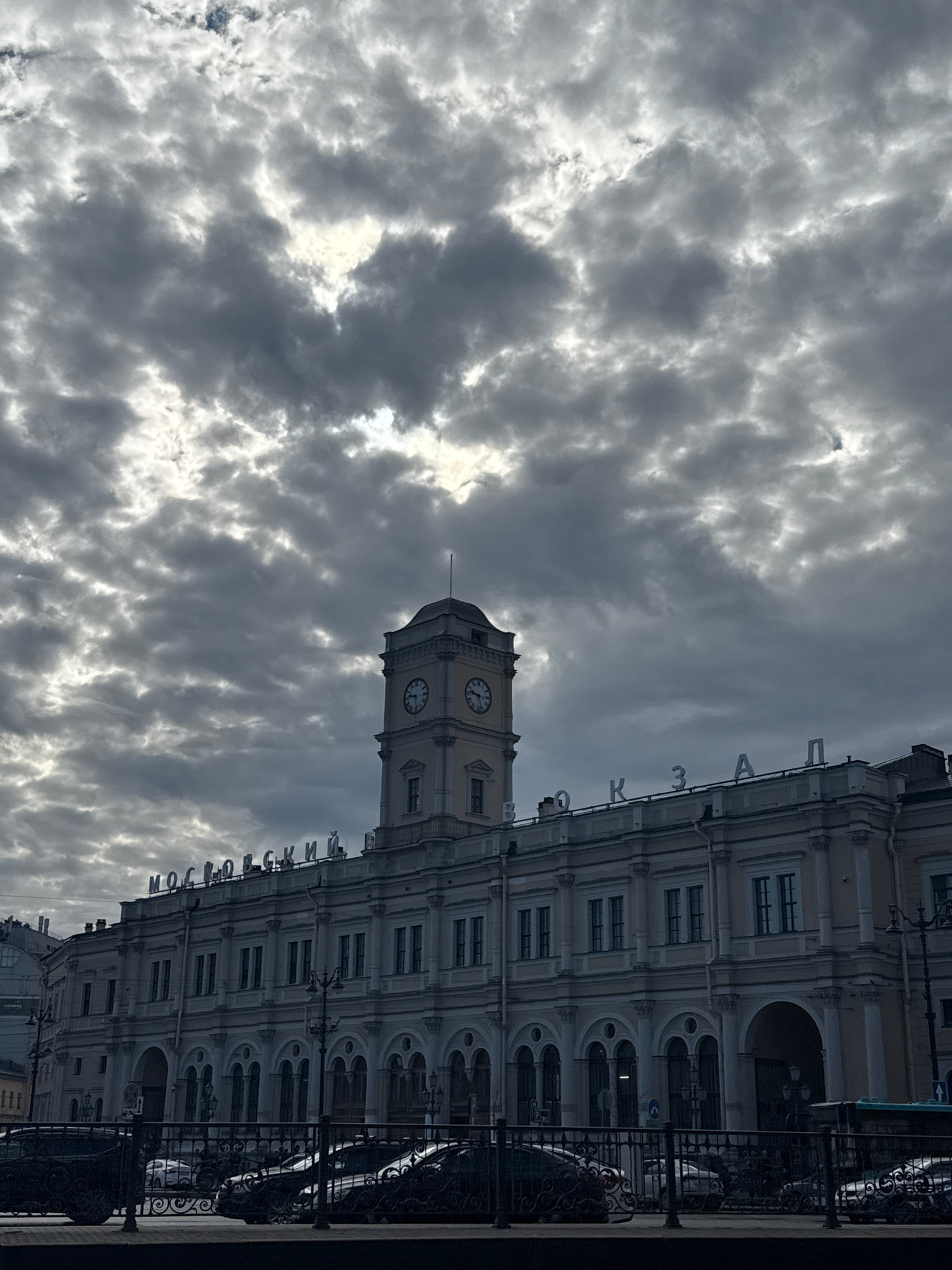The image displays a grand, classical-style building under a dramatic, heavily overcast sky, oriented as if viewed from across a street or elevated position. The setting is an urban environment, ident…read more