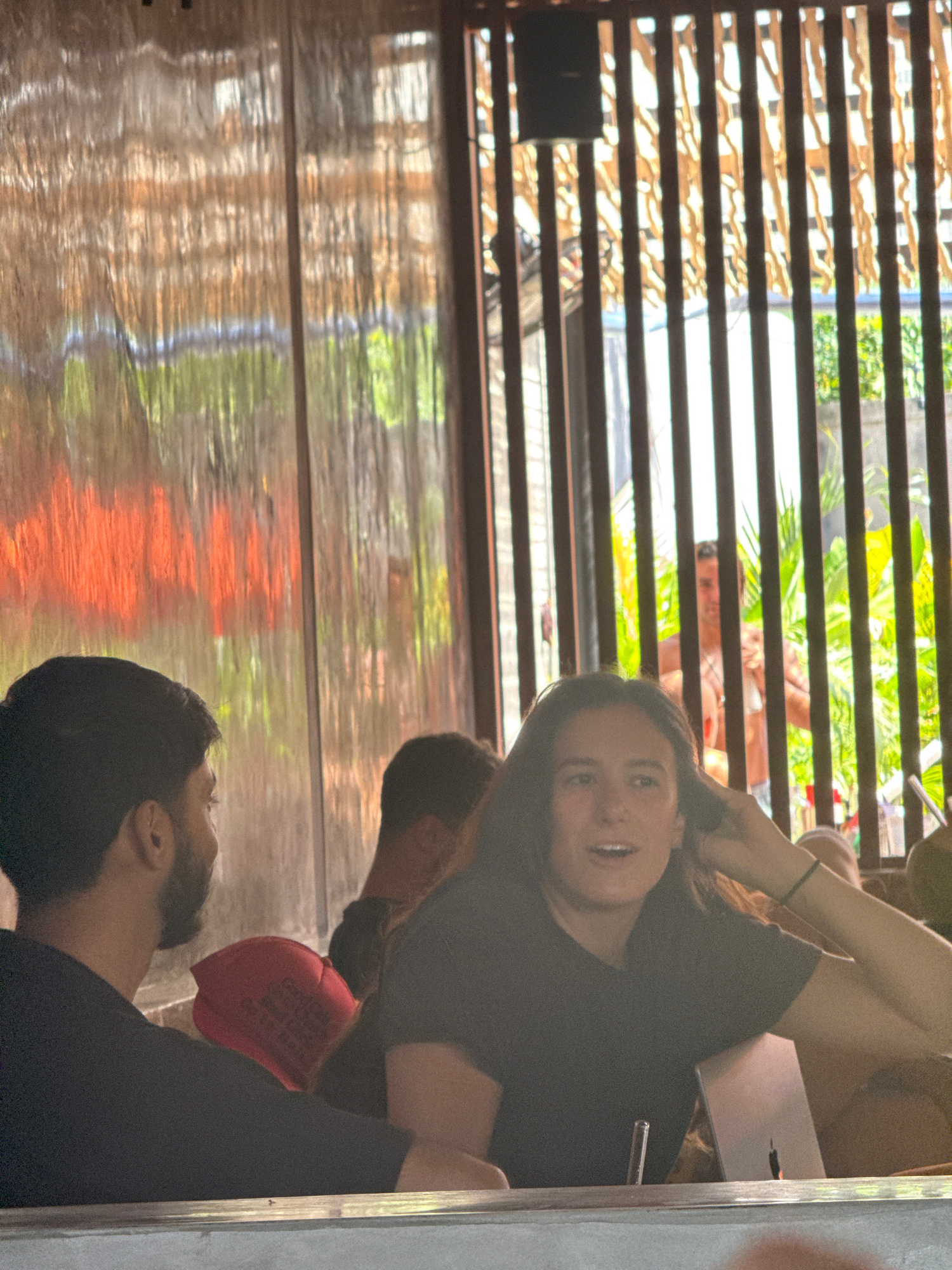 The image shows a group of people seated at a table. A woman in a black shirt is facing the camera, smiling. Another person is partially visible to her right. To the left is a man with a beard and blaβ¦read more