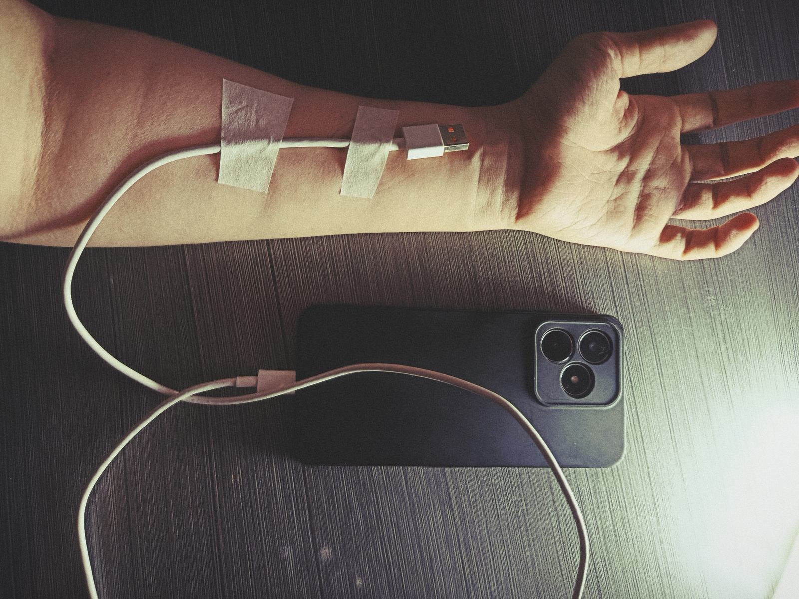 The image presents a human forearm and hand resting on a dark, textured surface, likely wood. A white USB charging cable is taped along the forearm using three strips of light-colored adhesive tape, r…read more