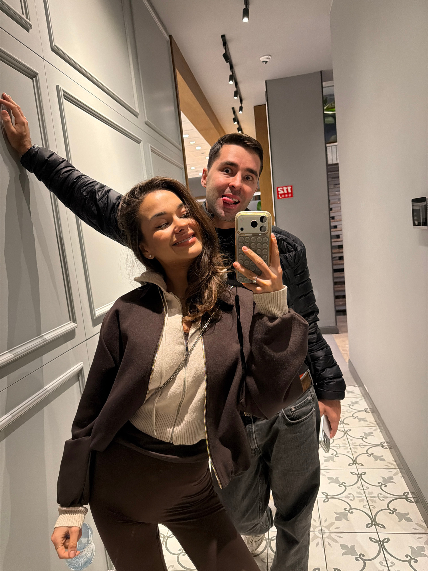 A man and a woman pose for a selfie in what appears to be an indoor location. The man, wearing a black jacket and dark jeans, is sticking his tongue out playfully towards the camera. He is holding a s…read more