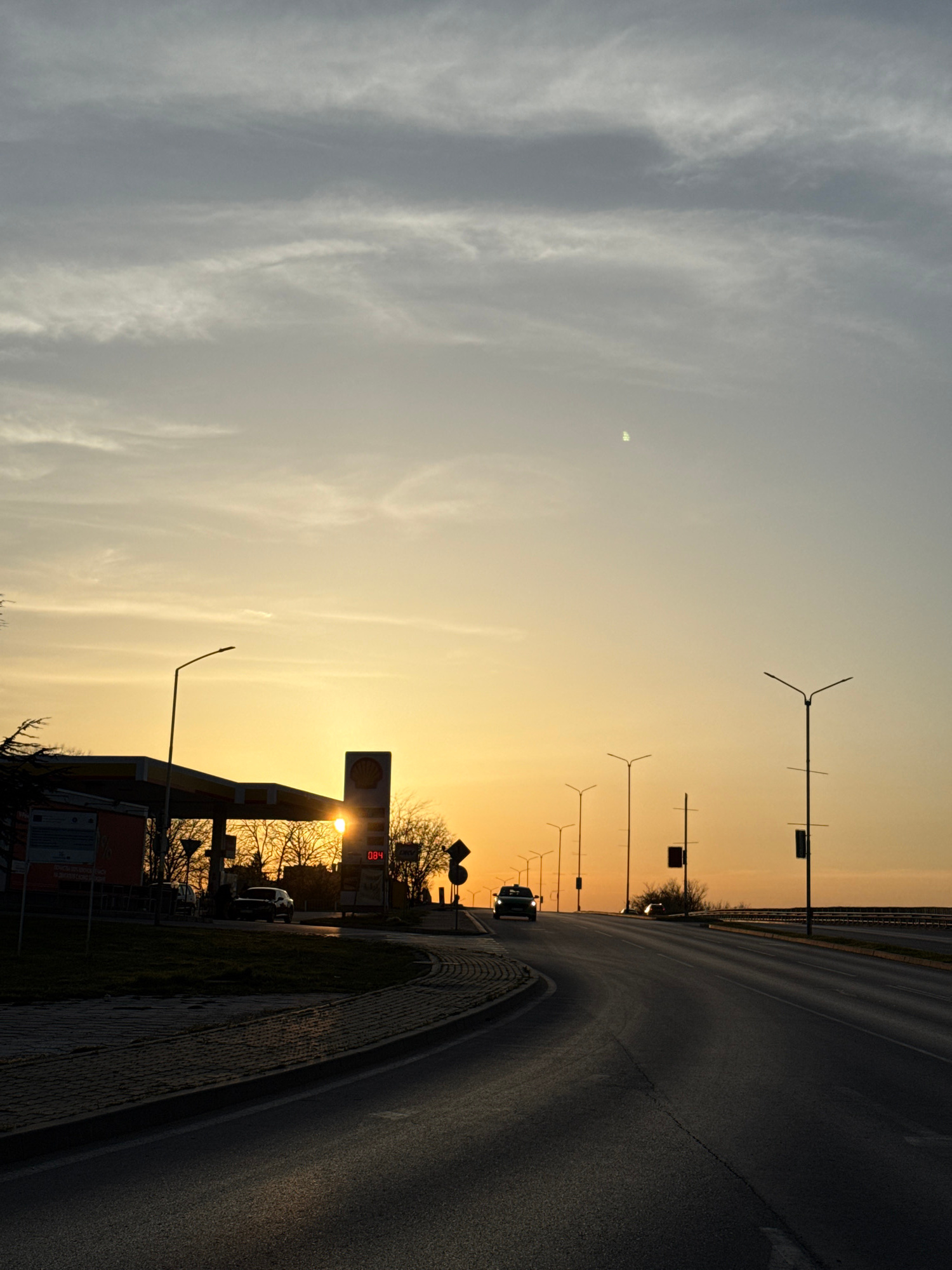 Captured at sunset in Dobrich, Bulgaria, a scene unfolds featuring a Shell gas station, silhouetted against the warm glow. The price display reads "0.84." A road curves beside the station, streetlight…read more