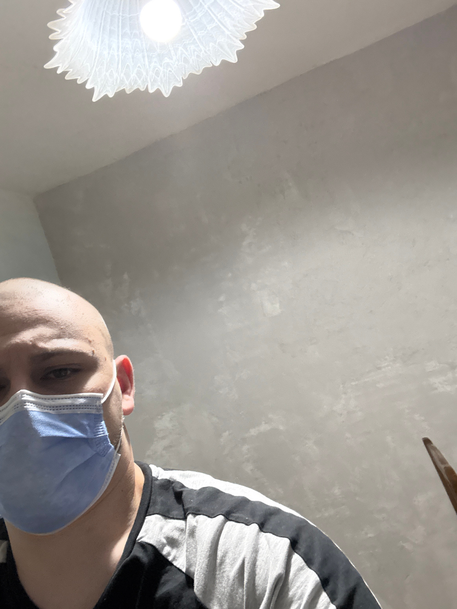 A low-angle shot looking up at a person with a shaved head wearing a blue surgical mask. The person is wearing a black and white striped shirt. A decorative white light fixture is visible in the lower…read more