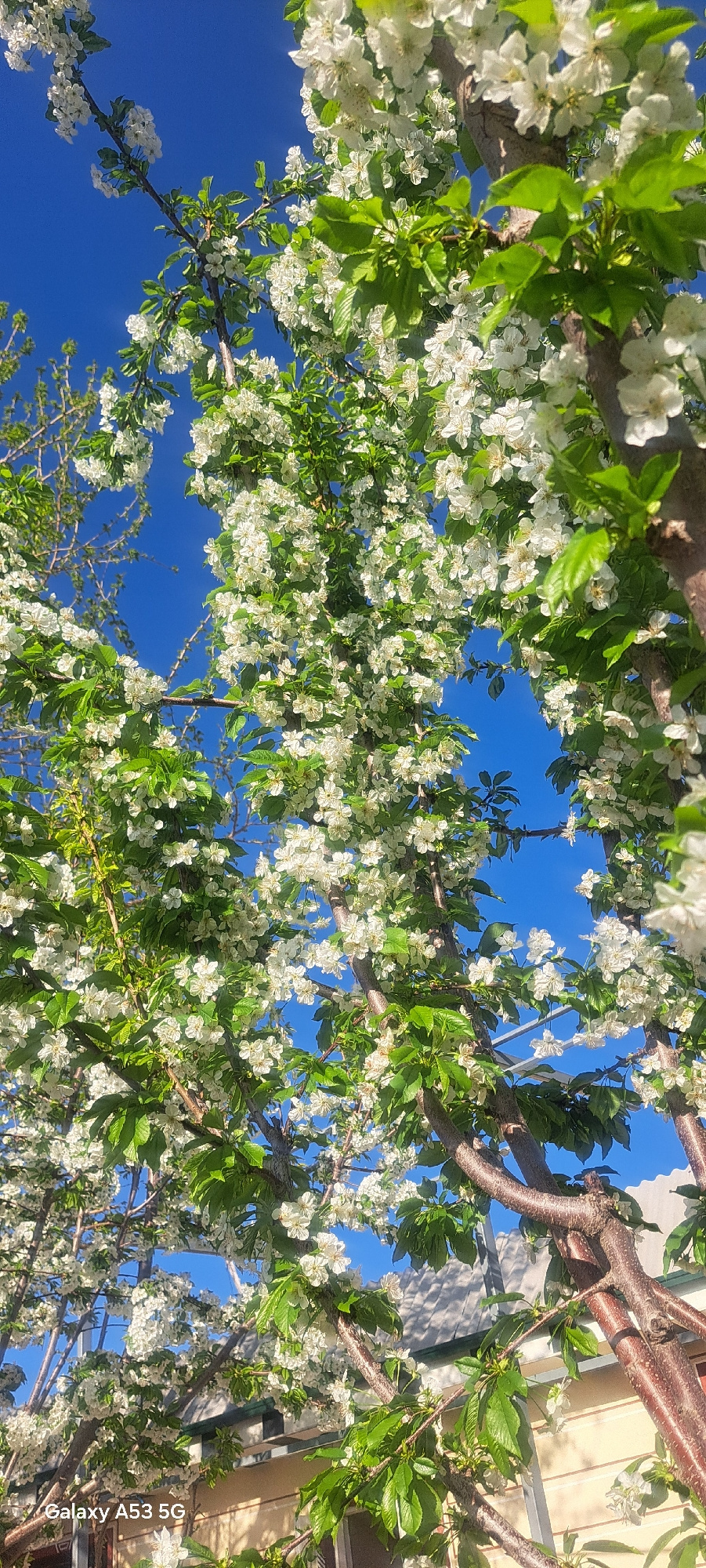 The image shows tree branches laden with white blossoms and green leaves set against a vivid blue sky. The upward angle suggests the photo was taken from below, looking up into the tree canopy. There…read more