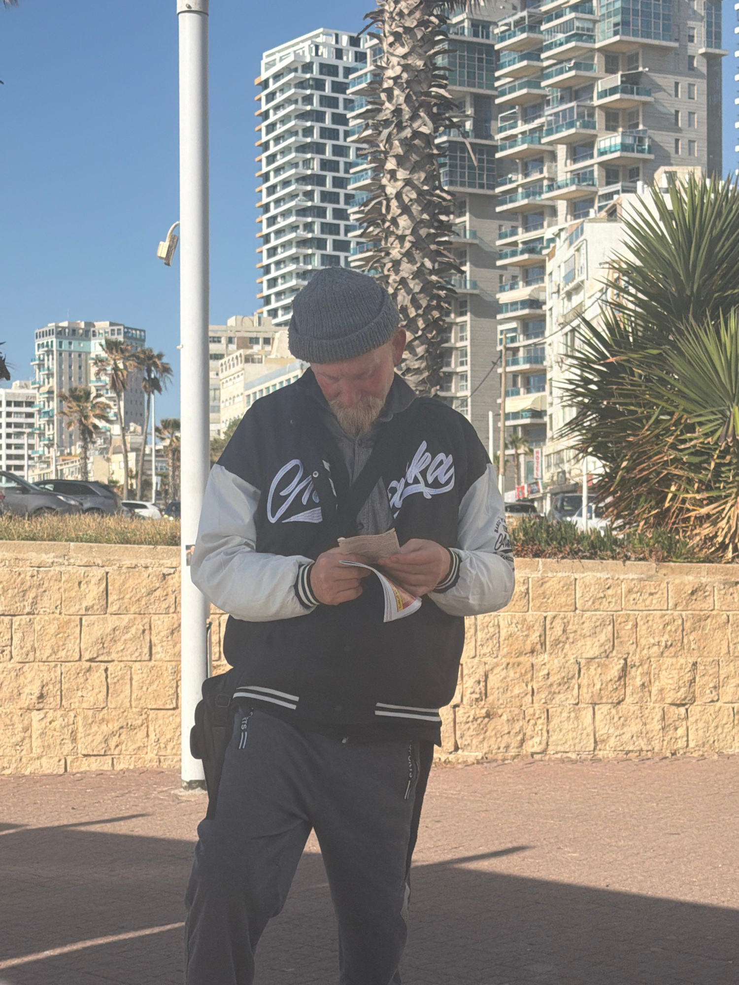 The image is a medium shot of a man standing on a walkway in Bat Yam, Israel. The man is fair-skinned, with a beard, and wearing a gray beanie, a black and white varsity jacket, and gray sweatpants. H…read more