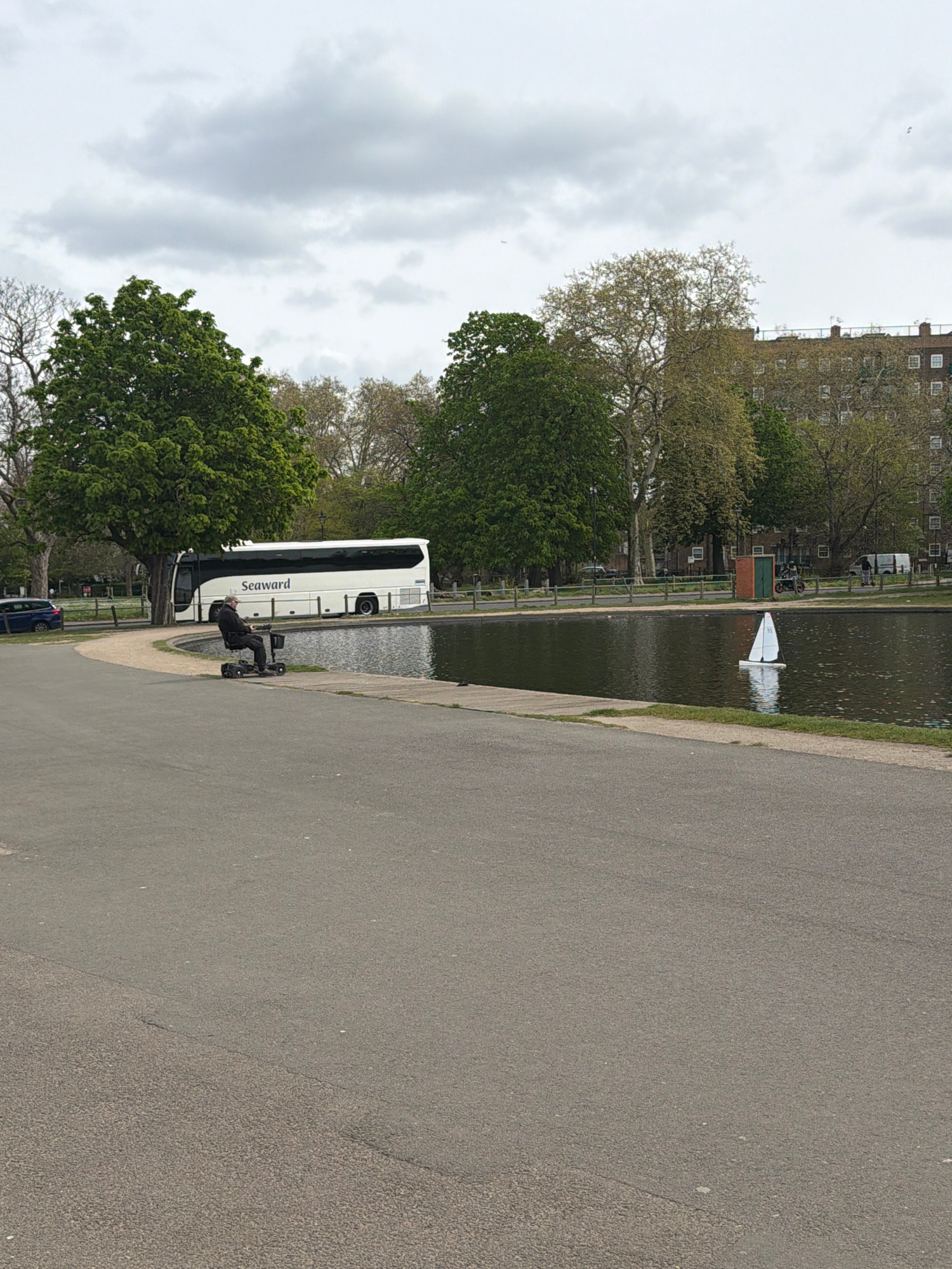 A horizontal image shows a paved path with a canal to the left. A large coach bus is parked alongside the canal bank. A person sits on a mobility scooter beside the bus, near the canal edge. A model s…read more
