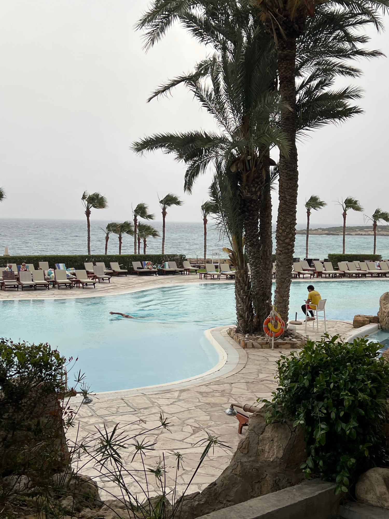 The image captures a tranquil resort scene in Peyia, Cyprus, taken from an elevated perspective looking down and across a swimming pool towards the sea under an overcast sky. The image is originally o…read more