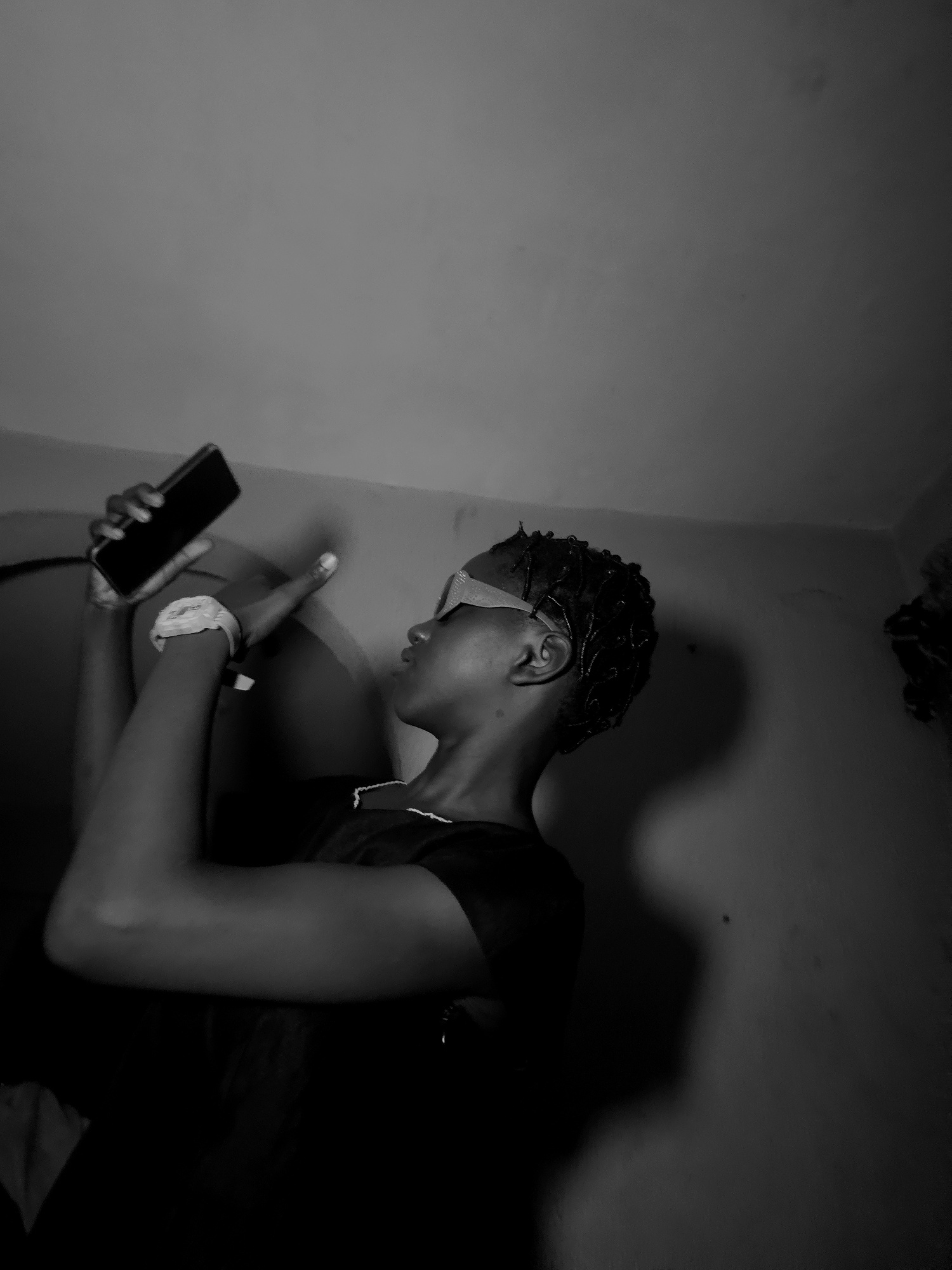 This black and white, medium close-up image captures a young adult in what appears to be an indoor setting in Asaba, Nigeria. The person is positioned on the right side of the frame, seen in profile,…read more