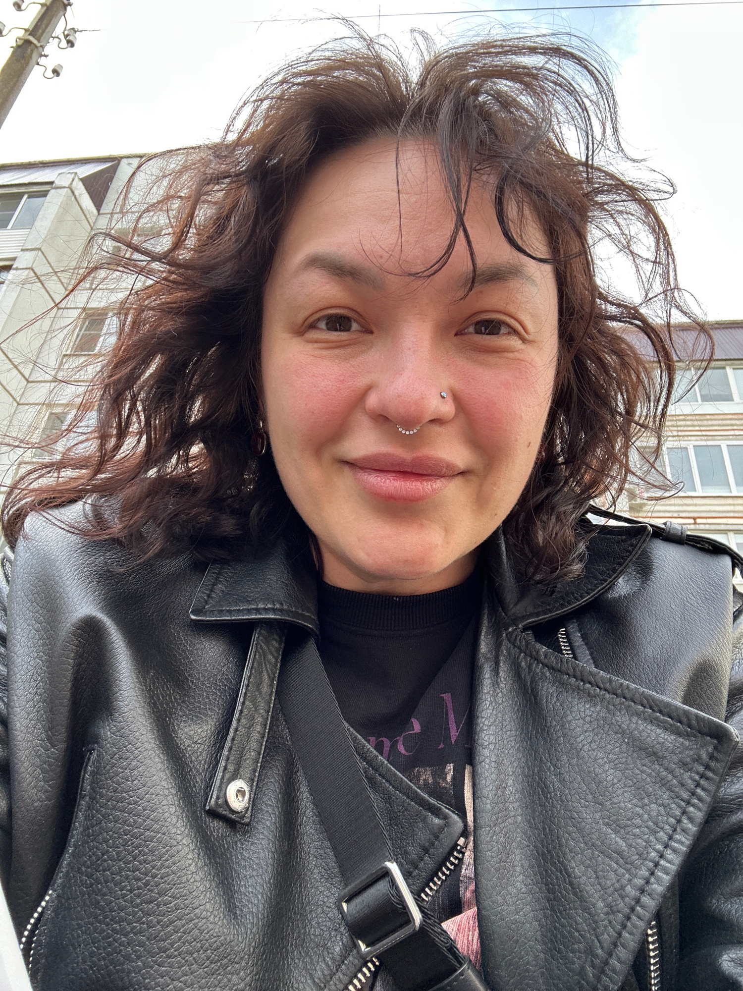 The image is a close-up, tilted selfie of an individual, likely taken outdoors in Chaikovsky, Russia, during daytime under an overcast sky. The main subject is an adult with medium-length, wavy dark…read more
