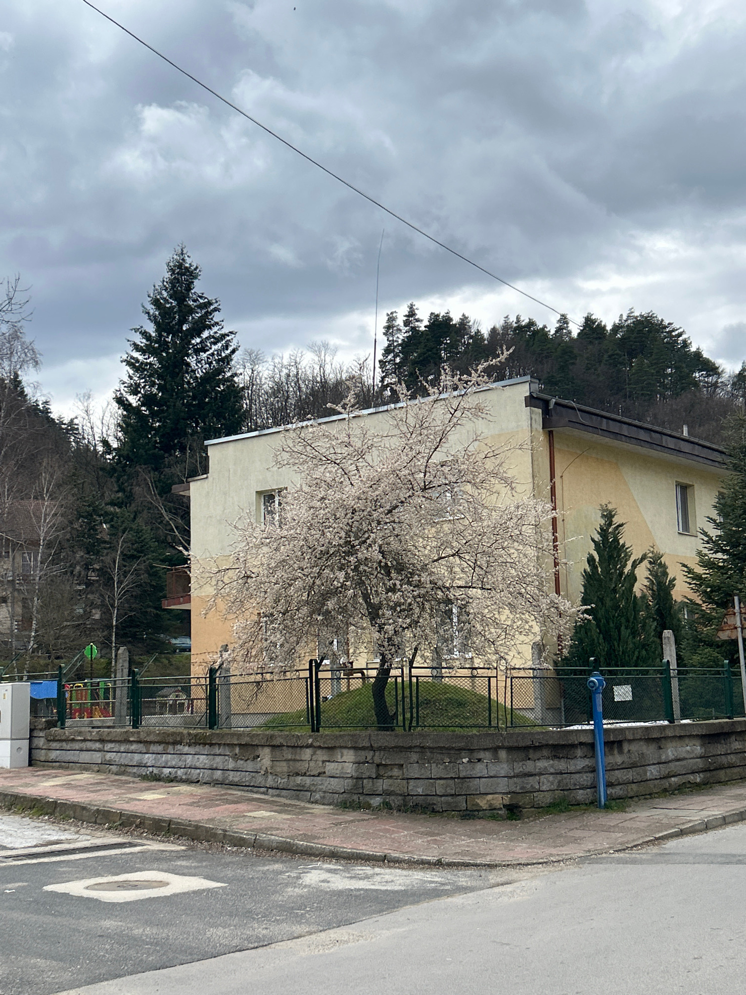 The image depicts a cloudy outdoor scene in Zlatograd, Bulgaria. A light yellow building with a dark roof stands surrounded by tall evergreen trees and a tree with white blossoms in the foreground. A…read more