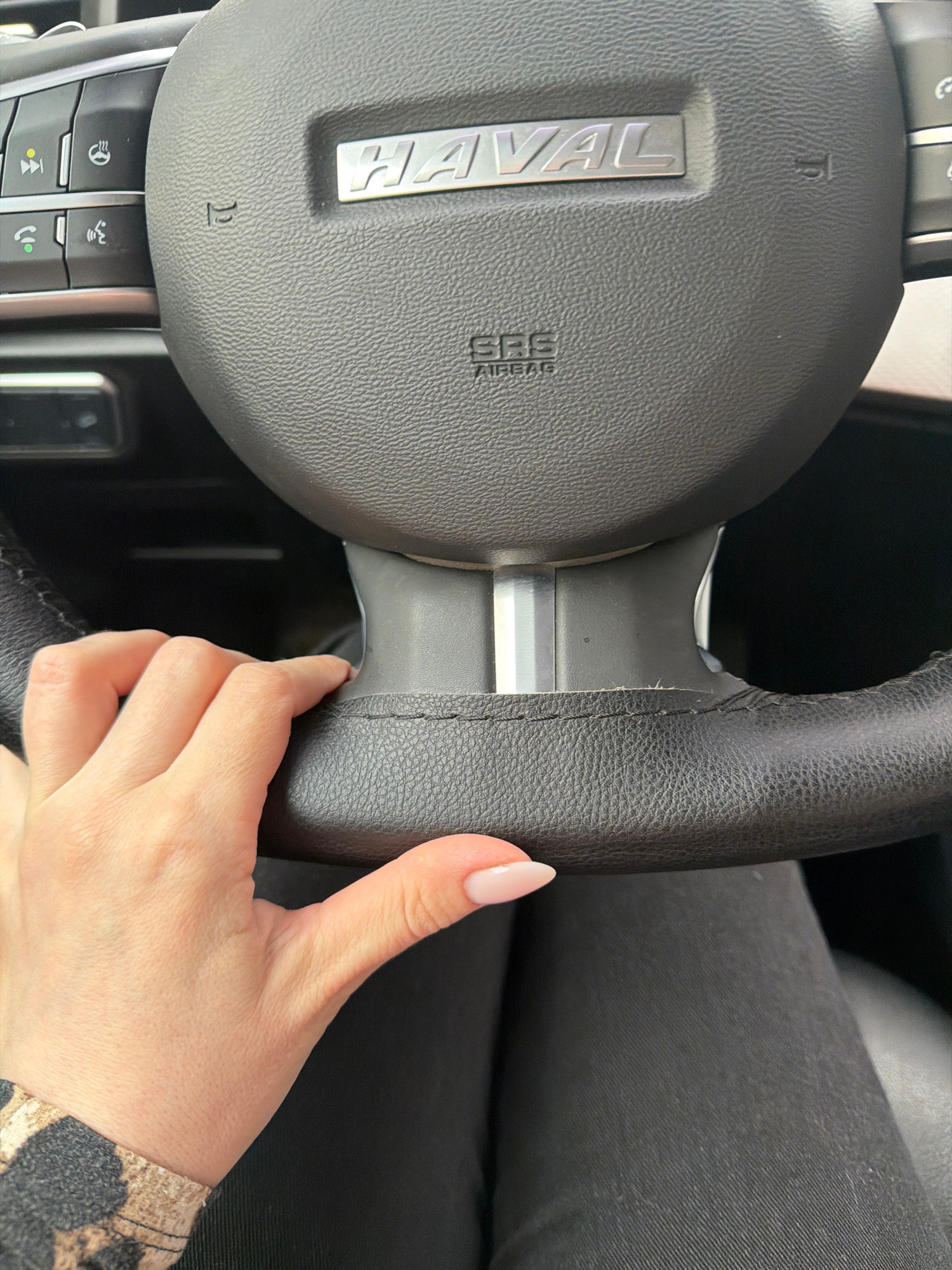 The image shows the steering wheel of a Haval car. The car's logo, "HAVAL," is visible on the central part of the steering wheel. The steering wheel is black, with silver accents. A person's hand with…read more