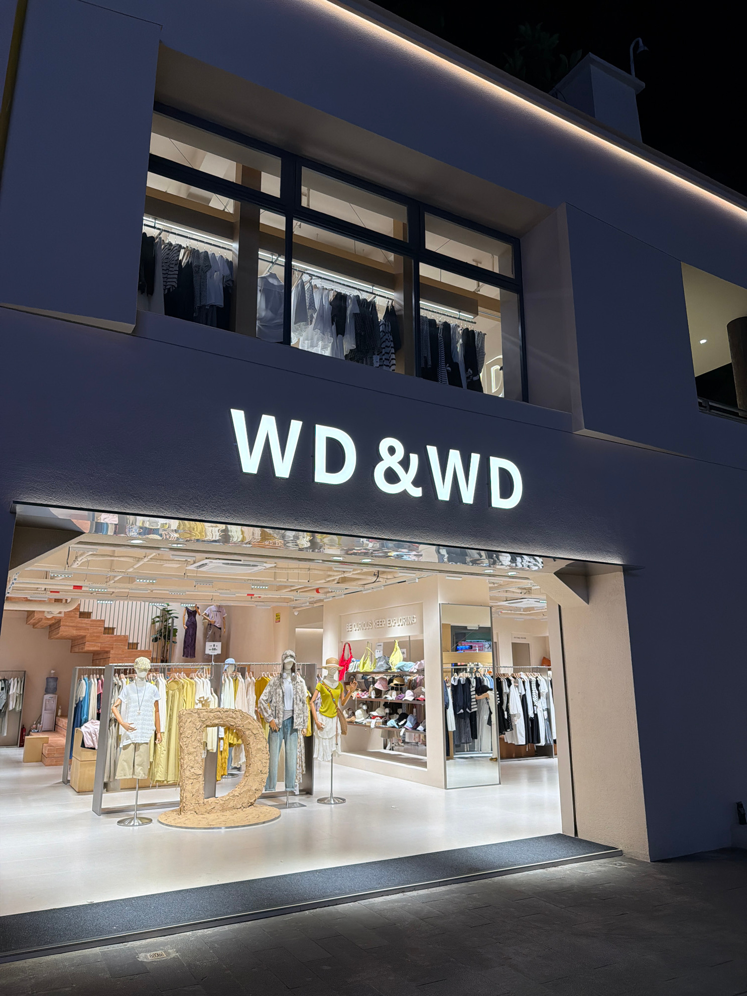 The image shows a daytime view of the "WD & WD" store, located in the Chongqing High-tech Zone, China. The store's name is prominently displayed on the facade in large, illuminated white letters. Thro…read more