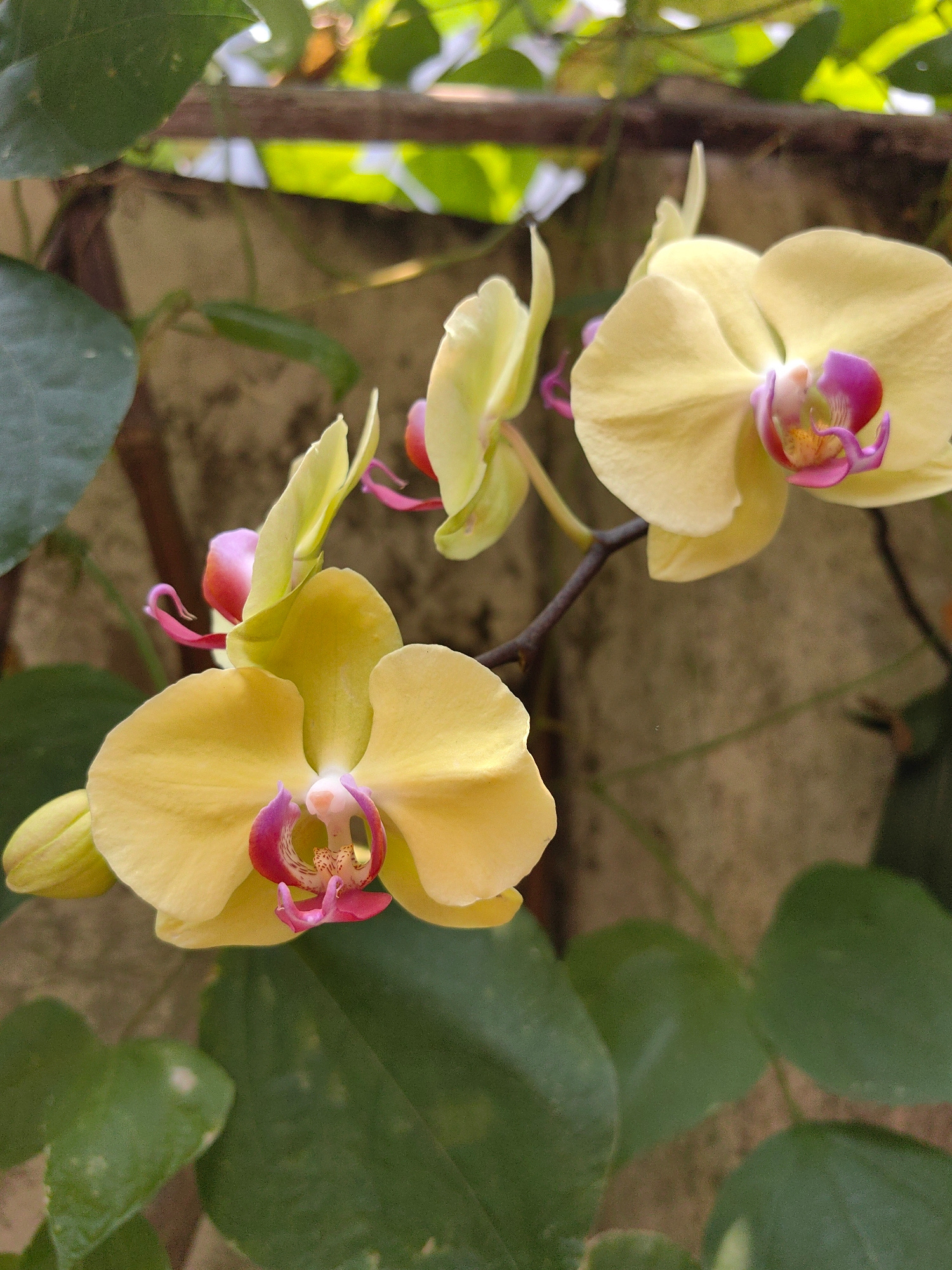The image depicts a cluster of yellow orchids with pink and red centers, growing against a wall with green foliage. The location is Bai Chay Ward, Vietnam. The scene contains close-up shots of the orcβ¦read more