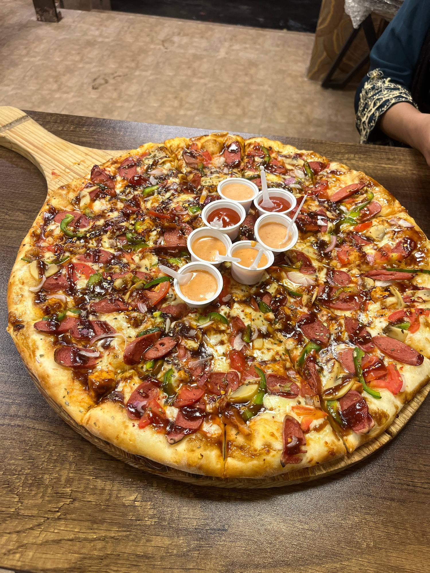 A pizza topped with sliced sausage, green bell peppers, sliced tomatoes, onions, mushrooms, and a dark sauce sits on a wooden paddle on a wooden table. Seven small plastic cups of sauce are arranged i…read more