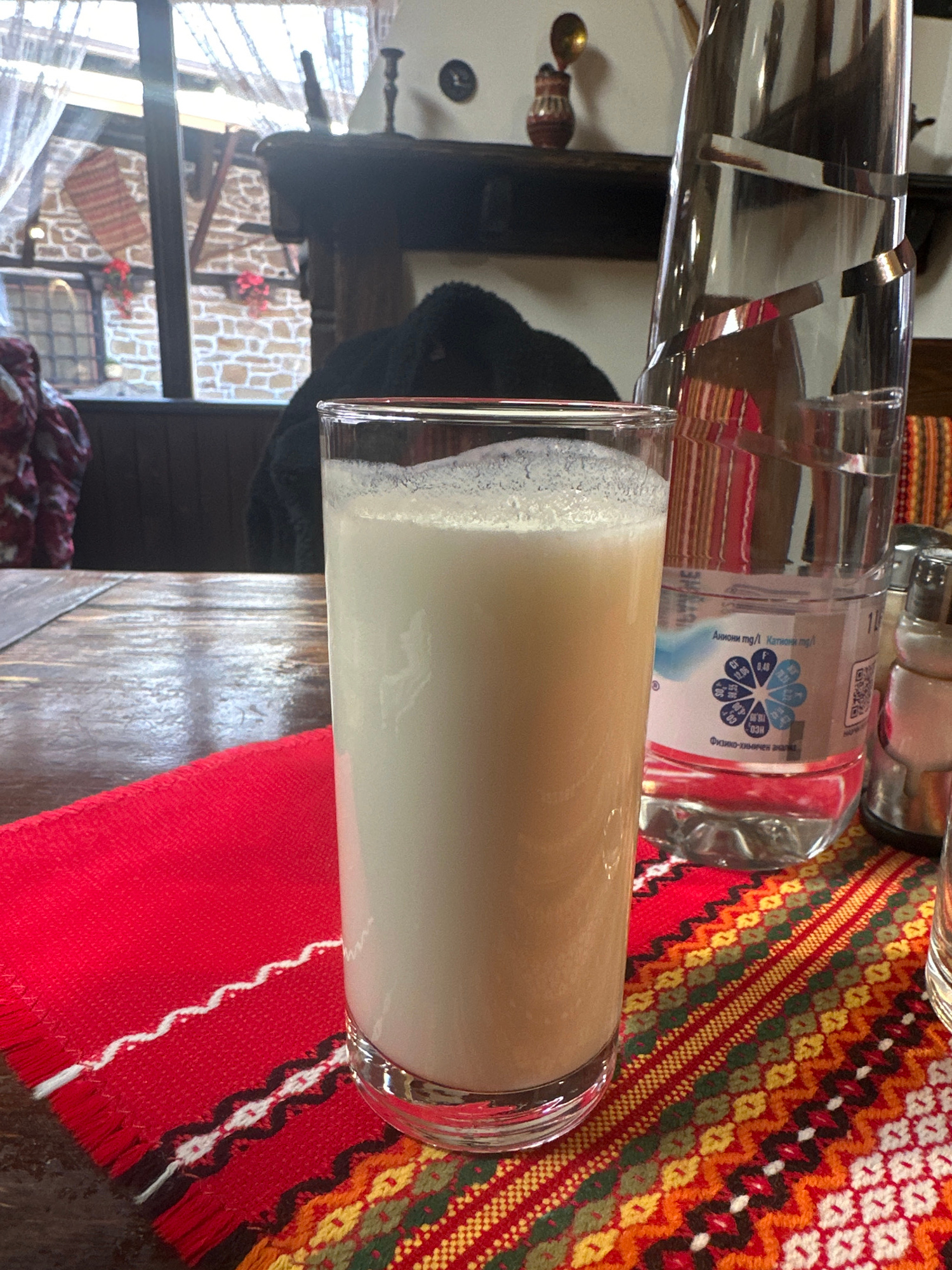The image shows a glass of airan on a table with a bottle of water, placed on a red and patterned placemat. In the background, there is a window looking out on a building with stone walls and a wroughβ¦read more