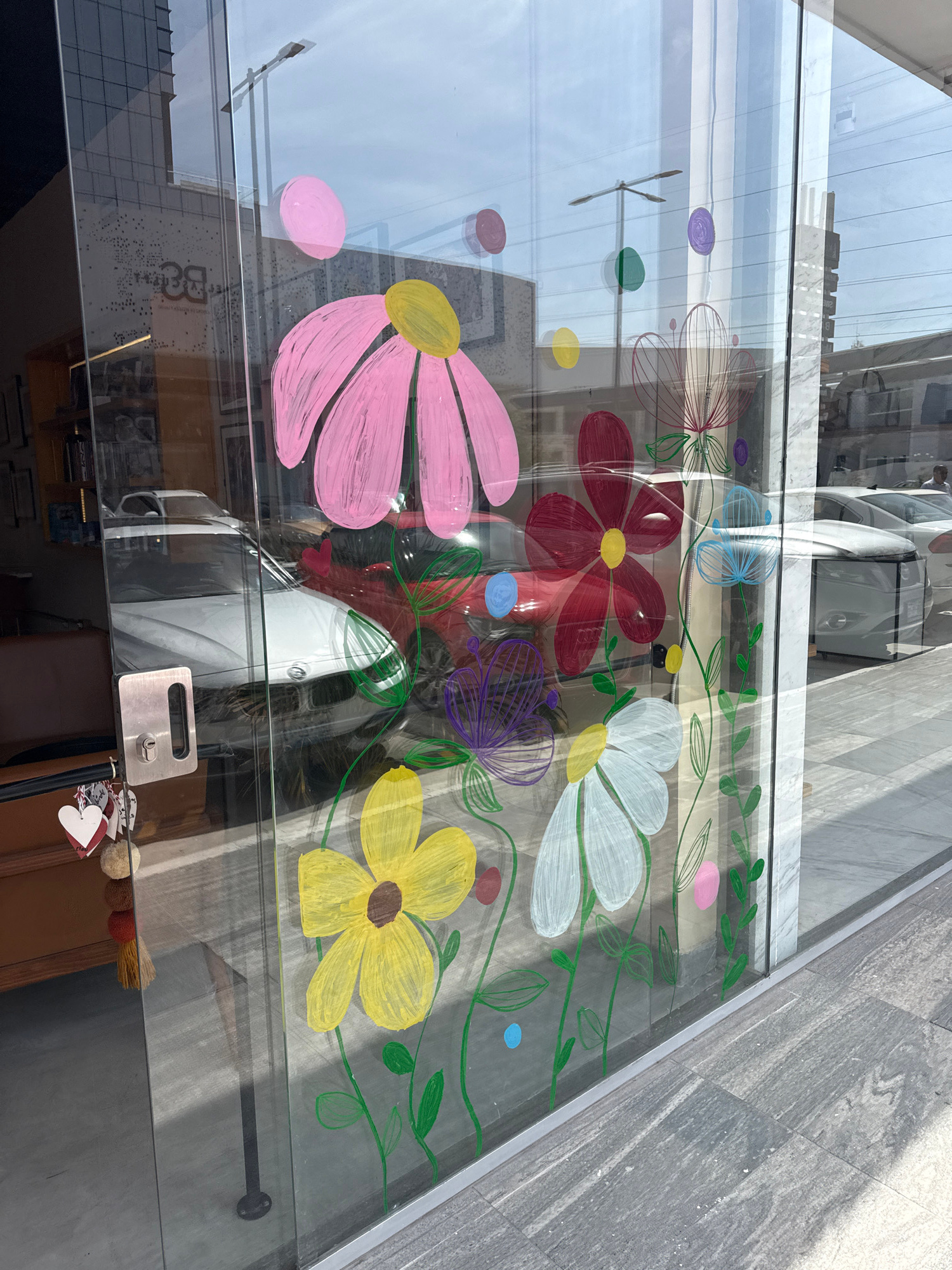 The image shows a window display in Puebla, Mexico, adorned with colorful floral paintings. The foreground reveals a glass pane decorated with a whimsical assortment of flowers in shades of pink, red,…read more