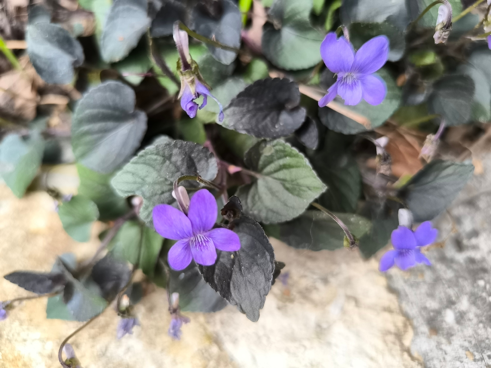The image shows a patch of dark-leaved violets (Viola) growing outdoors. Several purple violet flowers are visible amongst the foliage, some in full bloom and some buds. The background appears to be a…read more