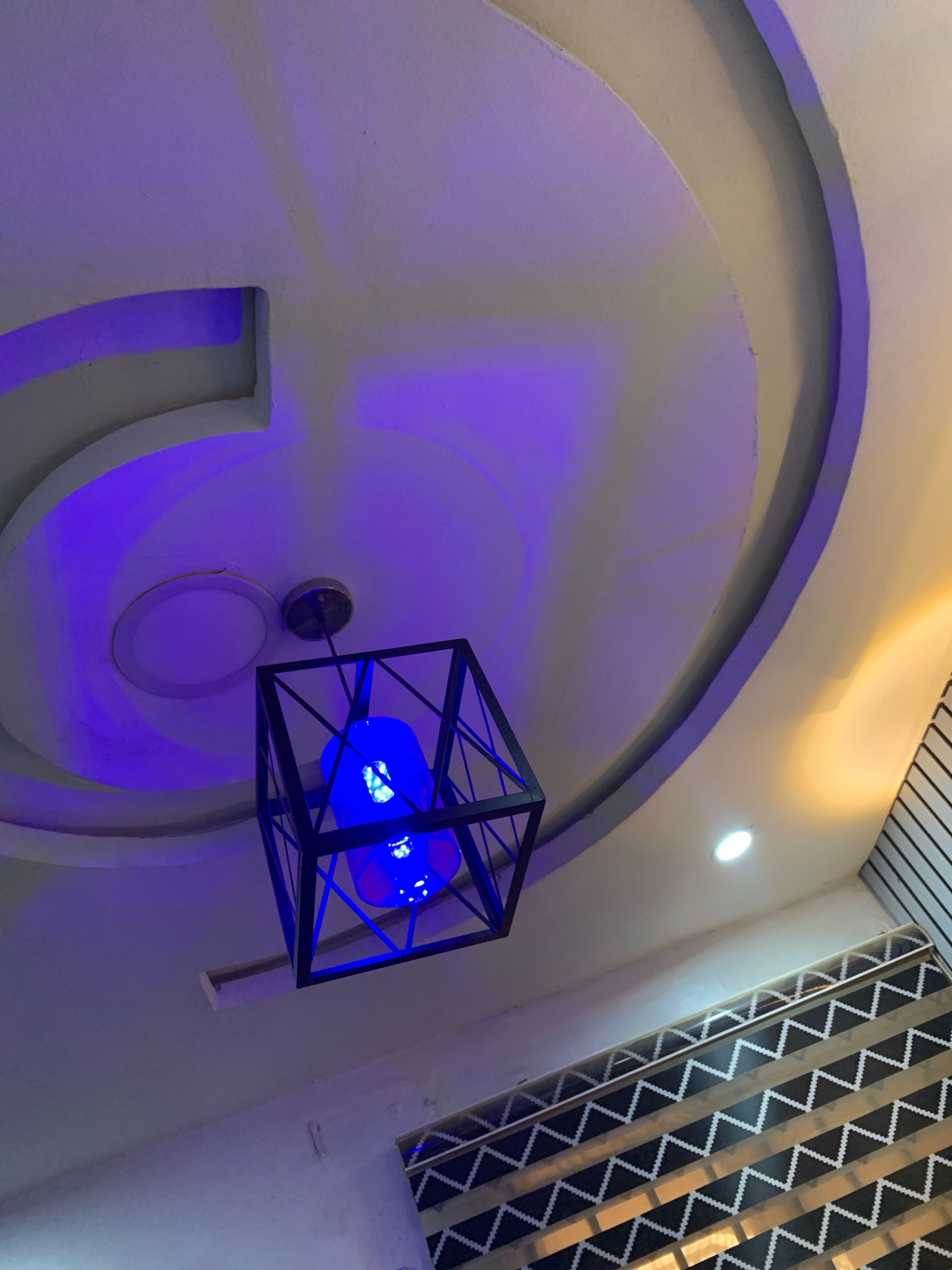 A low-angle shot presents an interior space featuring a decorative, circular, recessed ceiling design with a blue-tinted light effect. A cubic, black metal frame lamp fixture hangs centrally in front…read more