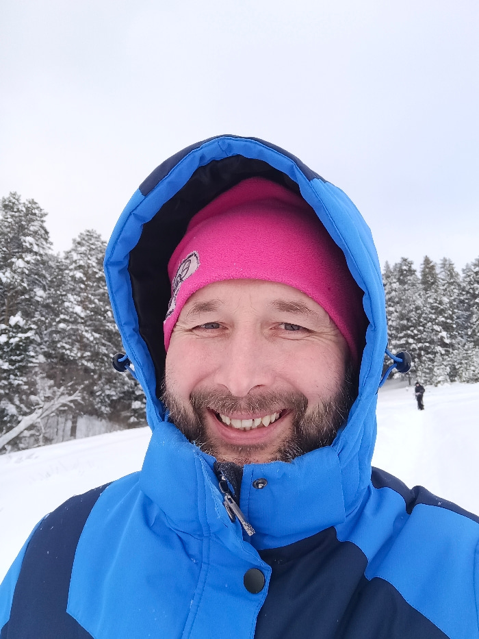 A close-up photograph, reportedly taken in Sarapul, Russia, depicts a male subject smiling outdoors in a snowy environment. The subject occupies the majority of the frame, positioned centrally and loo…read more