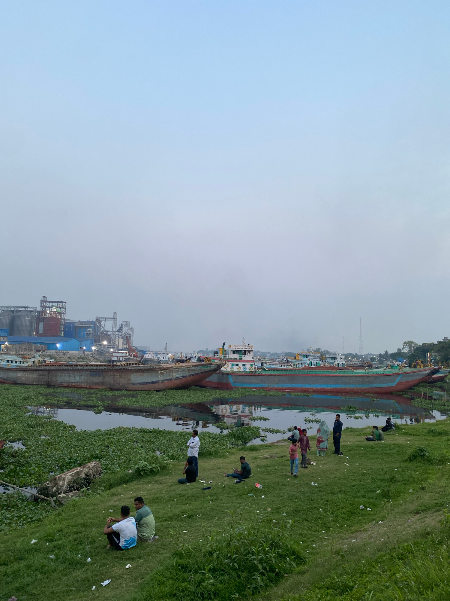 The image depicts a scene in Dhaka, Bangladesh, likely near the Buriganga River. Several large boats or ships are docked, with visible vegetation and structures associated with river transportation an…read more