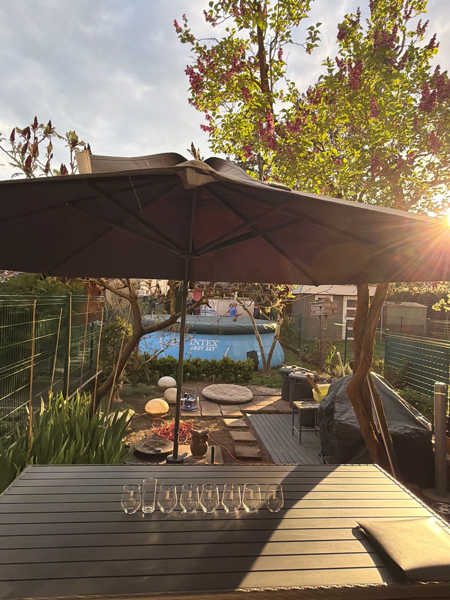 The image shows an outdoor scene in a backyard, likely in a residential area of Esch-sur-Alzette, Luxembourg. The setting features a garden with greenery, including trees, bushes, and grass. An Intex…read more