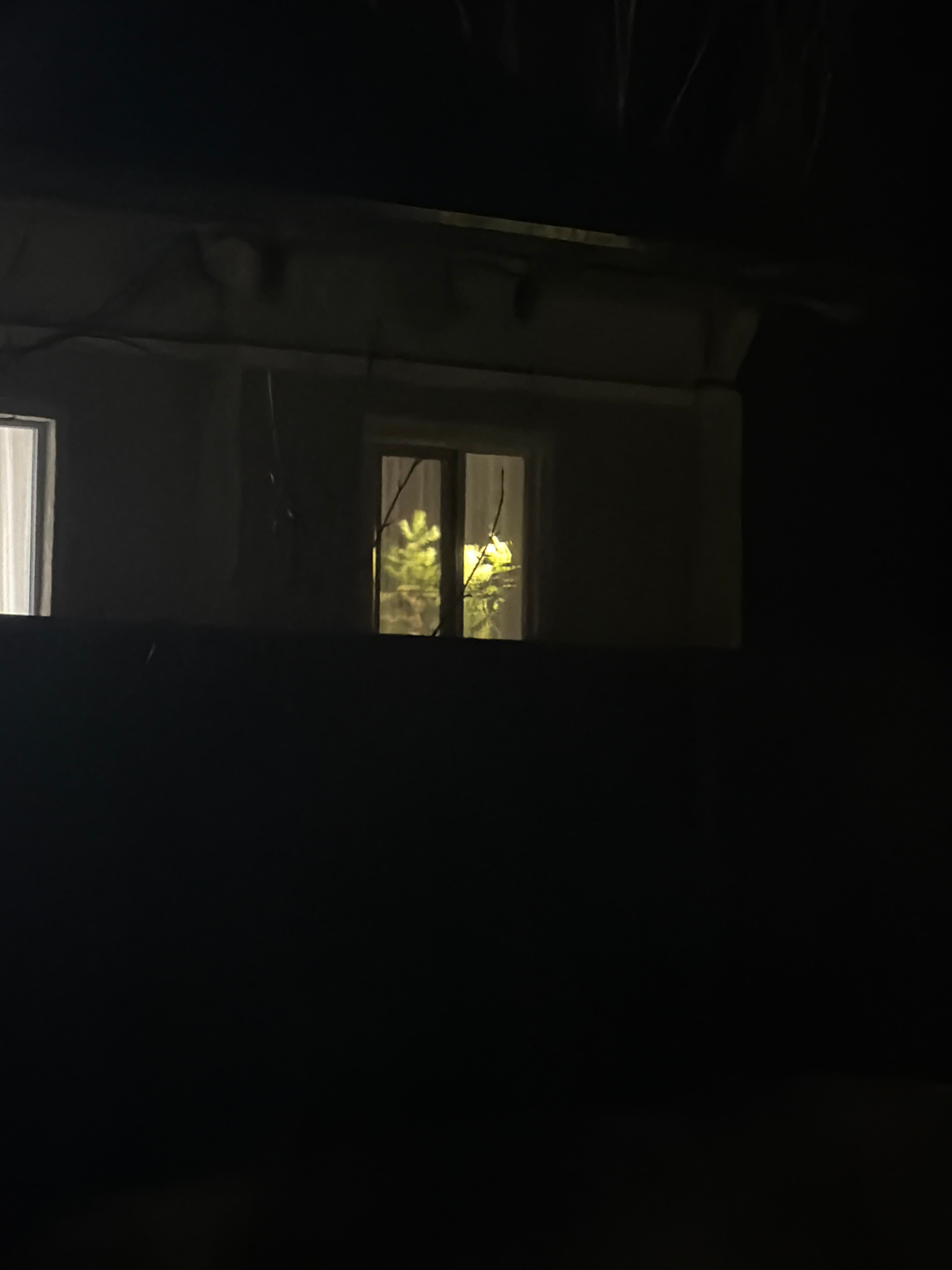 The image shows a building at night. Two windows are visible, with light emanating from within. A tree branch is seen outside the upper window. The location is Markovo, Russia.