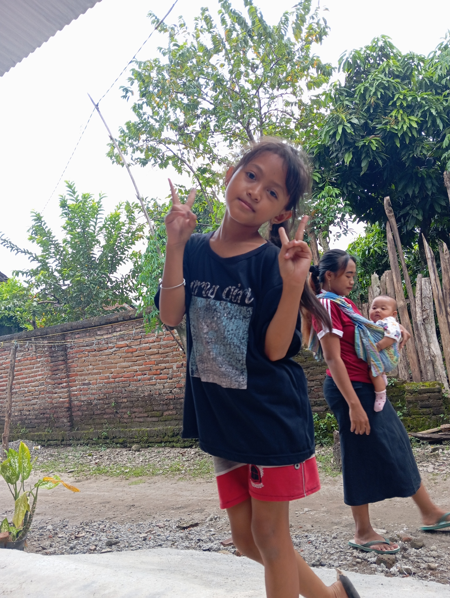 A photograph taken in Baron, Indonesia, depicts a young girl with dark hair pulled into pigtails, wearing a black shirt with a faded design and red shorts. She stands facing the camera, holding up bot…read more