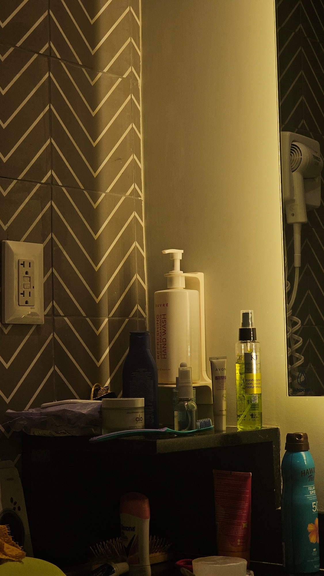 The image shows a bathroom scene, likely in Acapulco, Mexico given the Spanish text on some of the products. The wall and floor are tiled with a grey and white chevron pattern. An electrical outlet is…read more