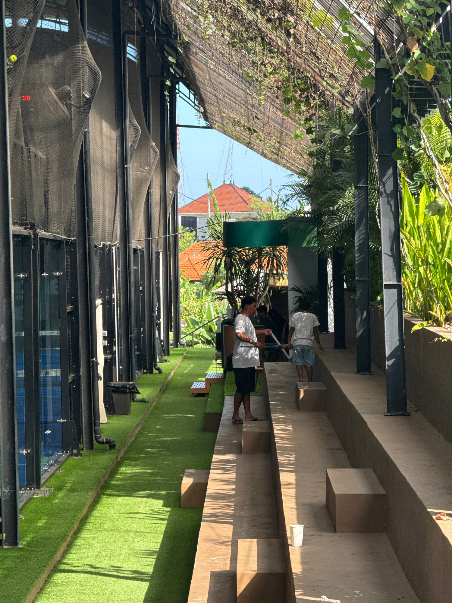 The image shows an outdoor area of what appears to be a tennis facility in North Kuta, Indonesia. The facility is characterized by several tennis courts, visible through a black netting material, and…read more