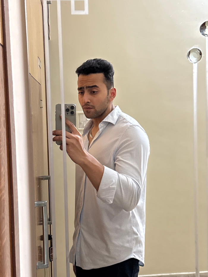 A man in a light blue, striped button-down shirt poses in a mirror. He holds a smartphone with his right hand, capturing a selfie. The reflection includes his dark hair, slight stubble, and a silver c…read more