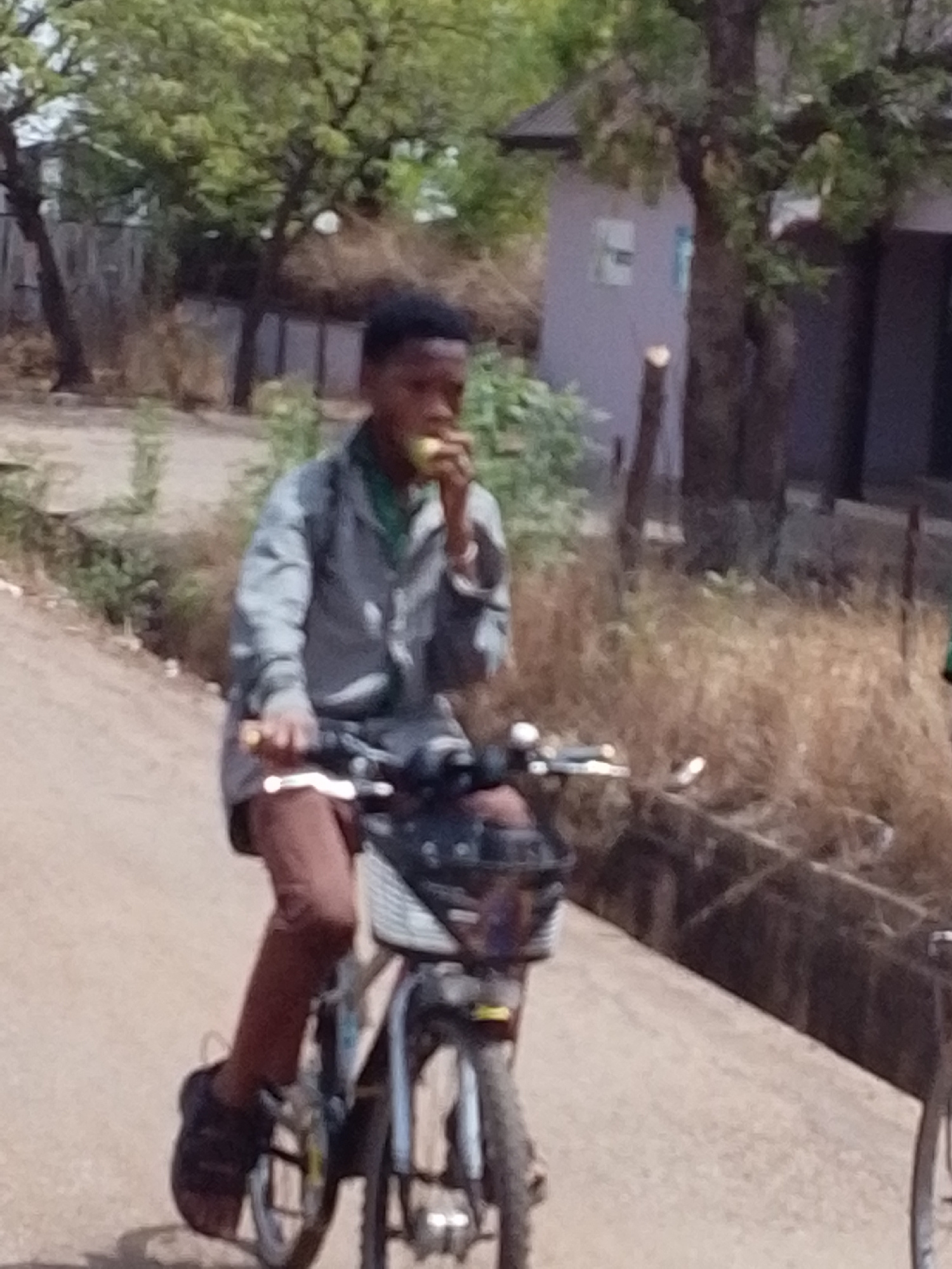 A youth rides a bicycle with a wire basket on the handlebars along a dirt road, possibly in the city of Tamale, Ghana. The rider is eating a round piece of fruit. The youth is wearing brown shorts, sa…read more