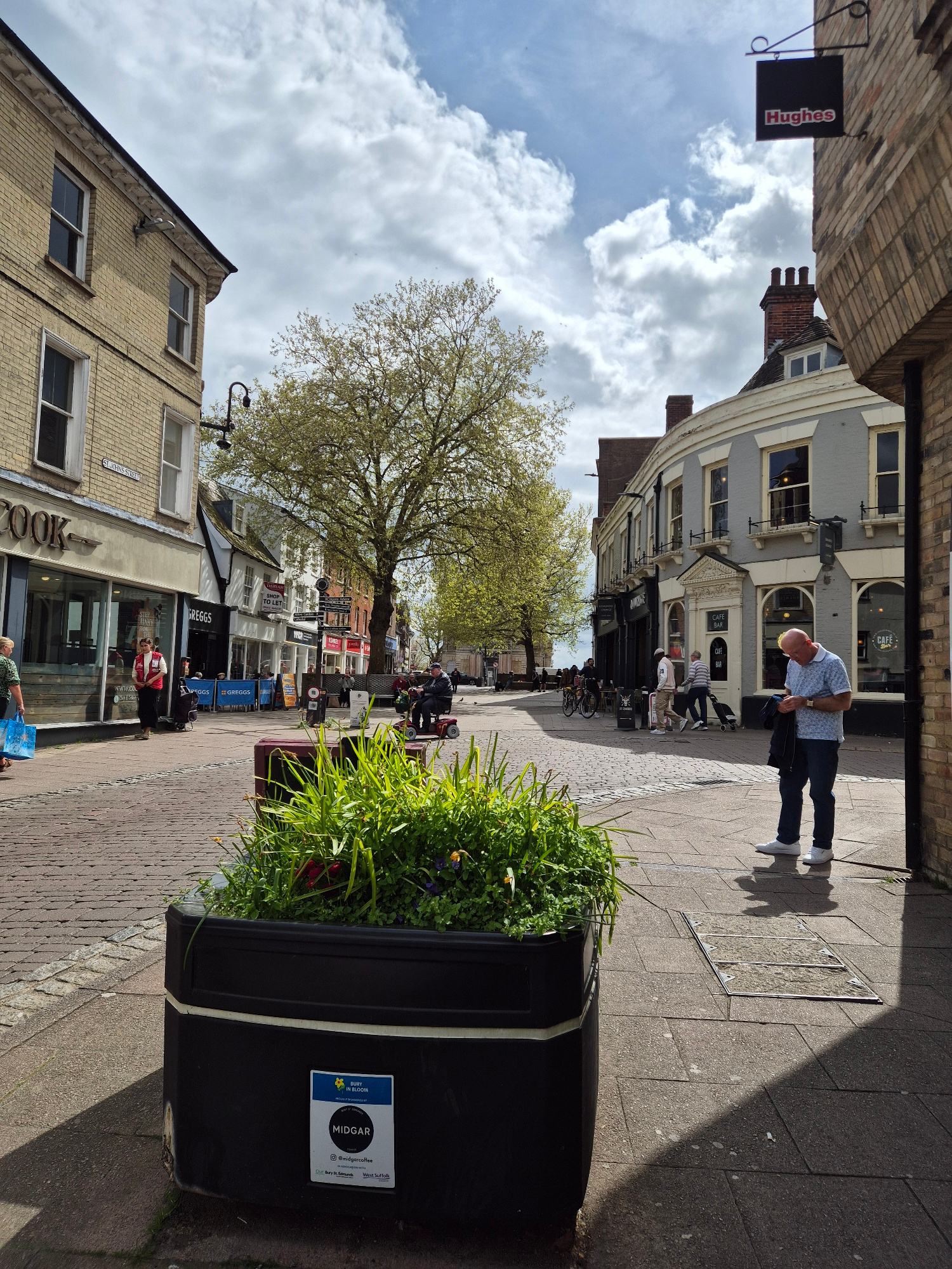 The image depicts a bustling street scene, likely a high street or commercial area, under a partly cloudy sky during daylight hours. The perspective is looking down the street, with buildings lining b…read more