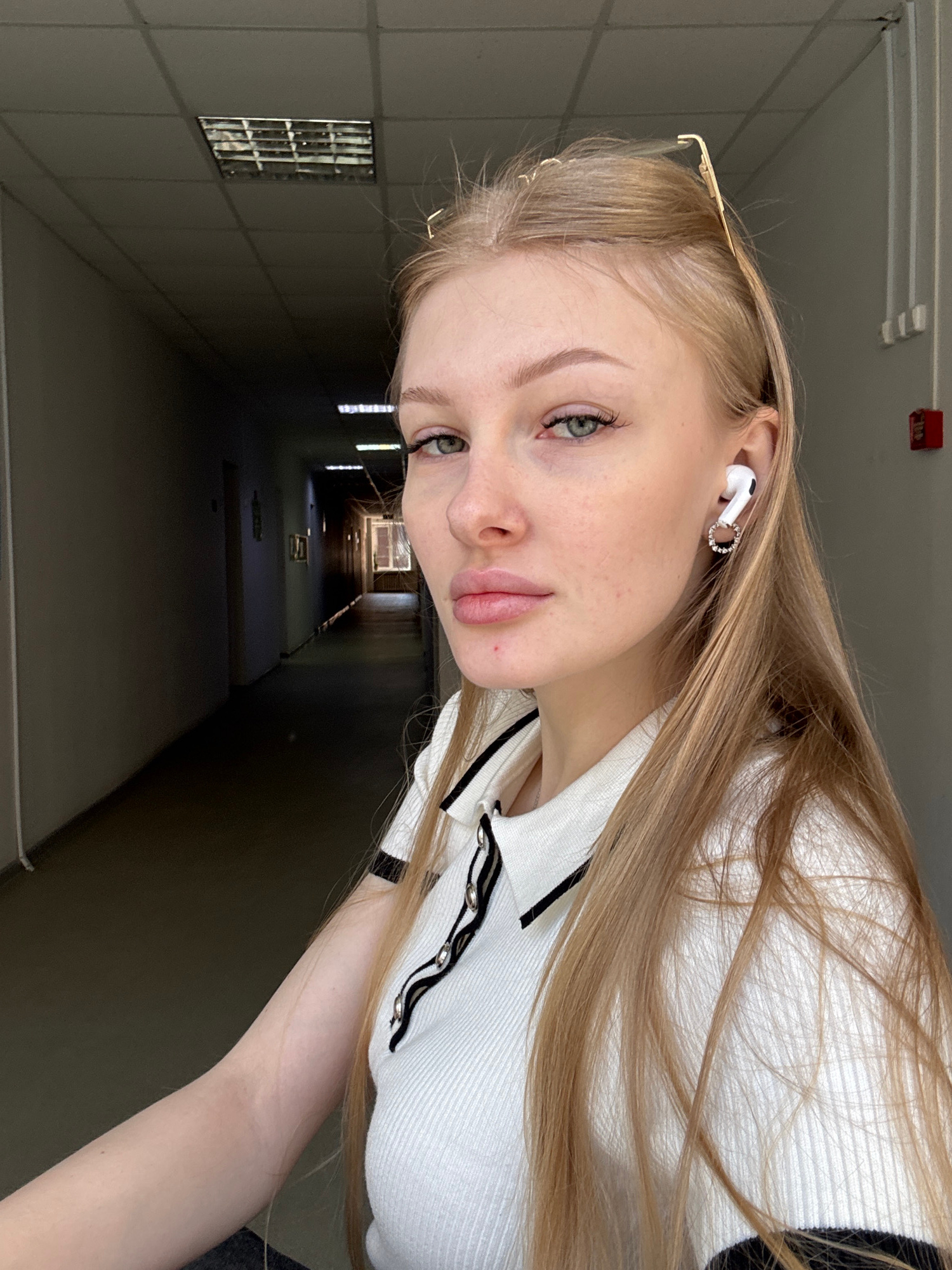 A young woman with long blonde hair and fair skin is in a hallway. She is wearing a white, collared shirt with black trim. She has an earbud in her left ear and a gold hair clip on her head. The hallw…read more