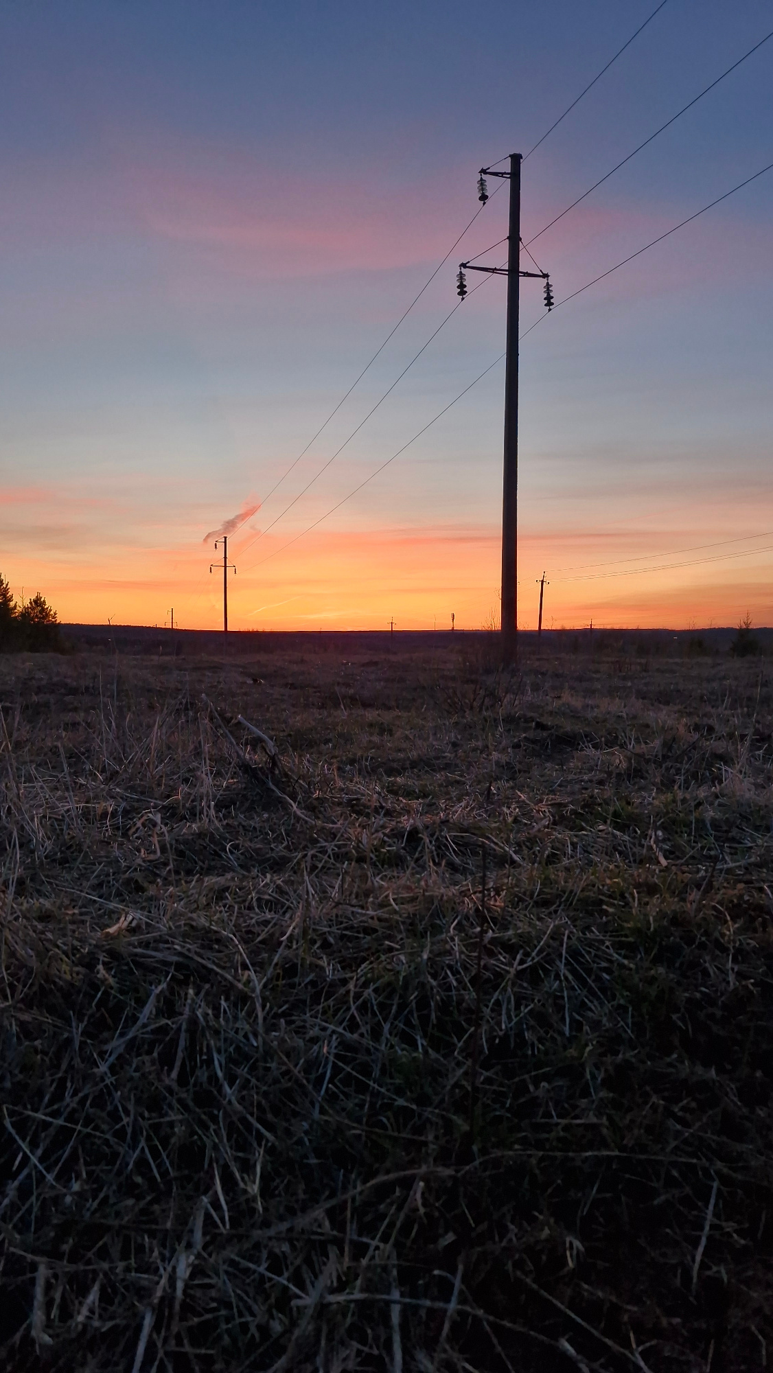 The image displays a serene rural landscape, likely captured during either sunrise or sunset in Otchor, Russia. The sky, dominating the upper portion of the scene, exhibits a stunning gradient of colo…read more