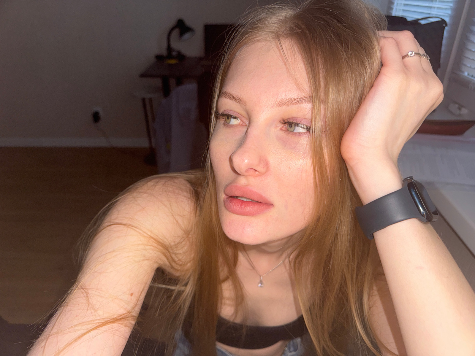 The image is an upside-down, close-up portrait of a young woman with long, light brown hair. Her head is positioned at the bottom of the frame, with her hair flowing upwards. She has fair skin, full l…read more