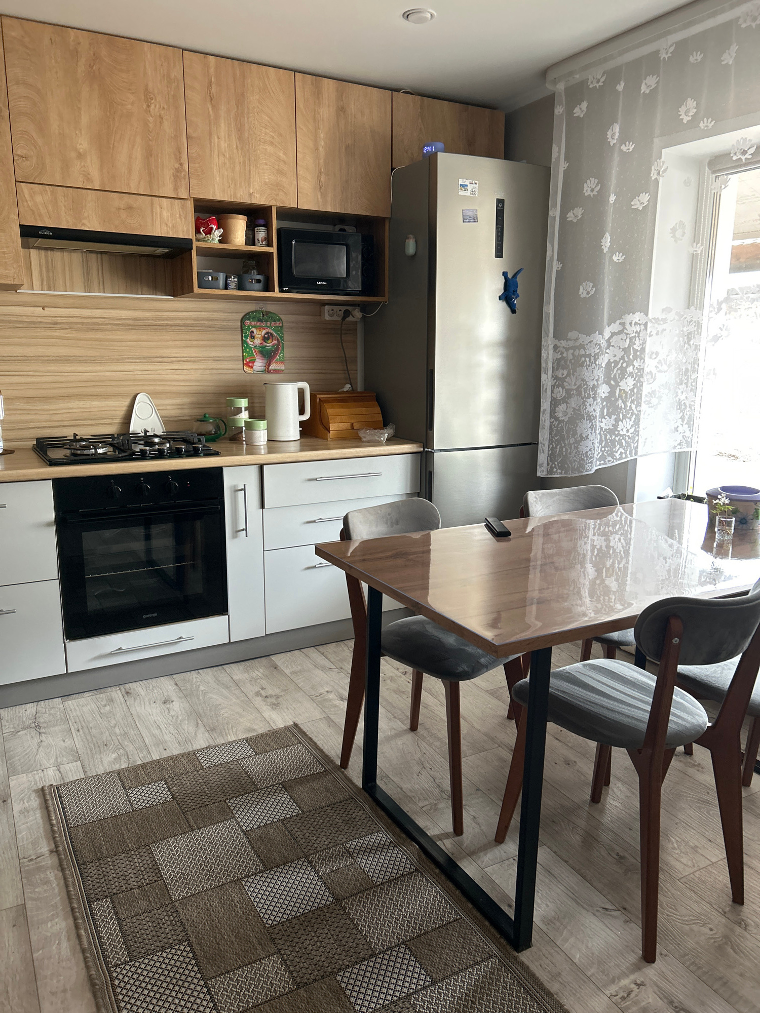 The image depicts a kitchen interior, possibly in Уральское, Russia. The kitchen features light wood cabinetry on the left and white cabinets on the right, with a stainless steel refrigerator standing…read more