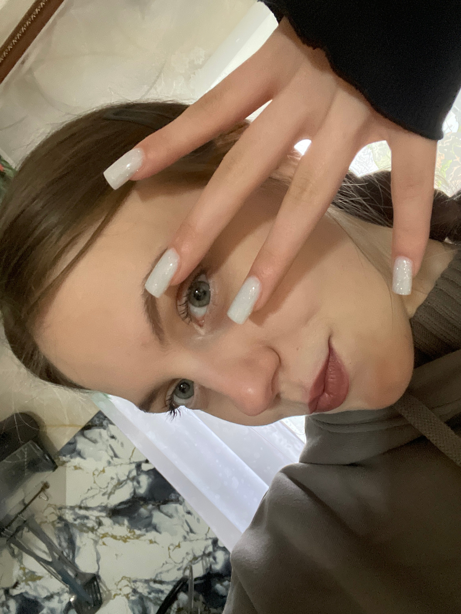 The image is a close-up, rotated selfie of a young individual, likely female, captured indoors. The subject has fair skin, light blue-green eyes, and brown hair partially visible. They gaze directly a…read more