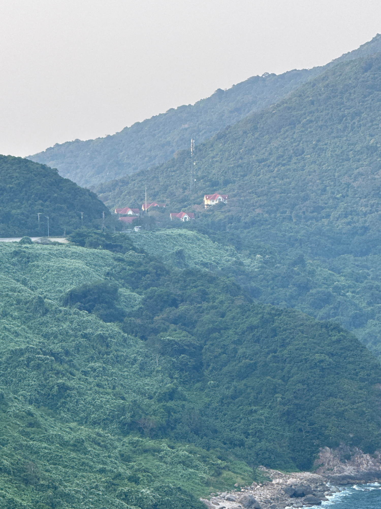 A landscape view of a mountainous area, potentially in the city of Đà Nẵng, Vietnam. The mountains are covered in dense green vegetation. Some buildings with red roofs can be seen on one of the mounta…read more