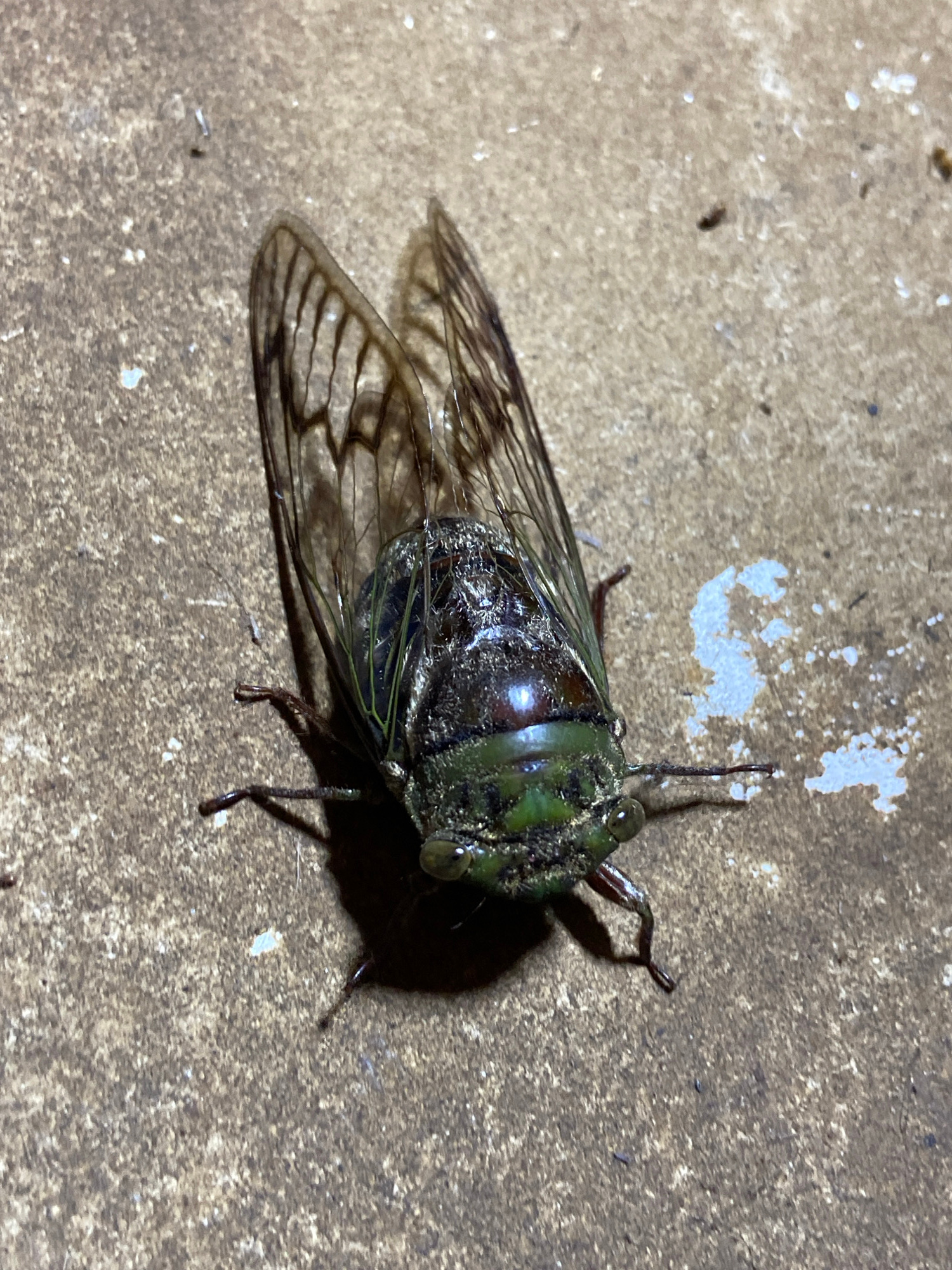 A cicada sits on a rough, tan surface. The cicada has green and brown markings on its body and clear wings with dark veins. The surface appears to be concrete or a similar material with light-colored…read more