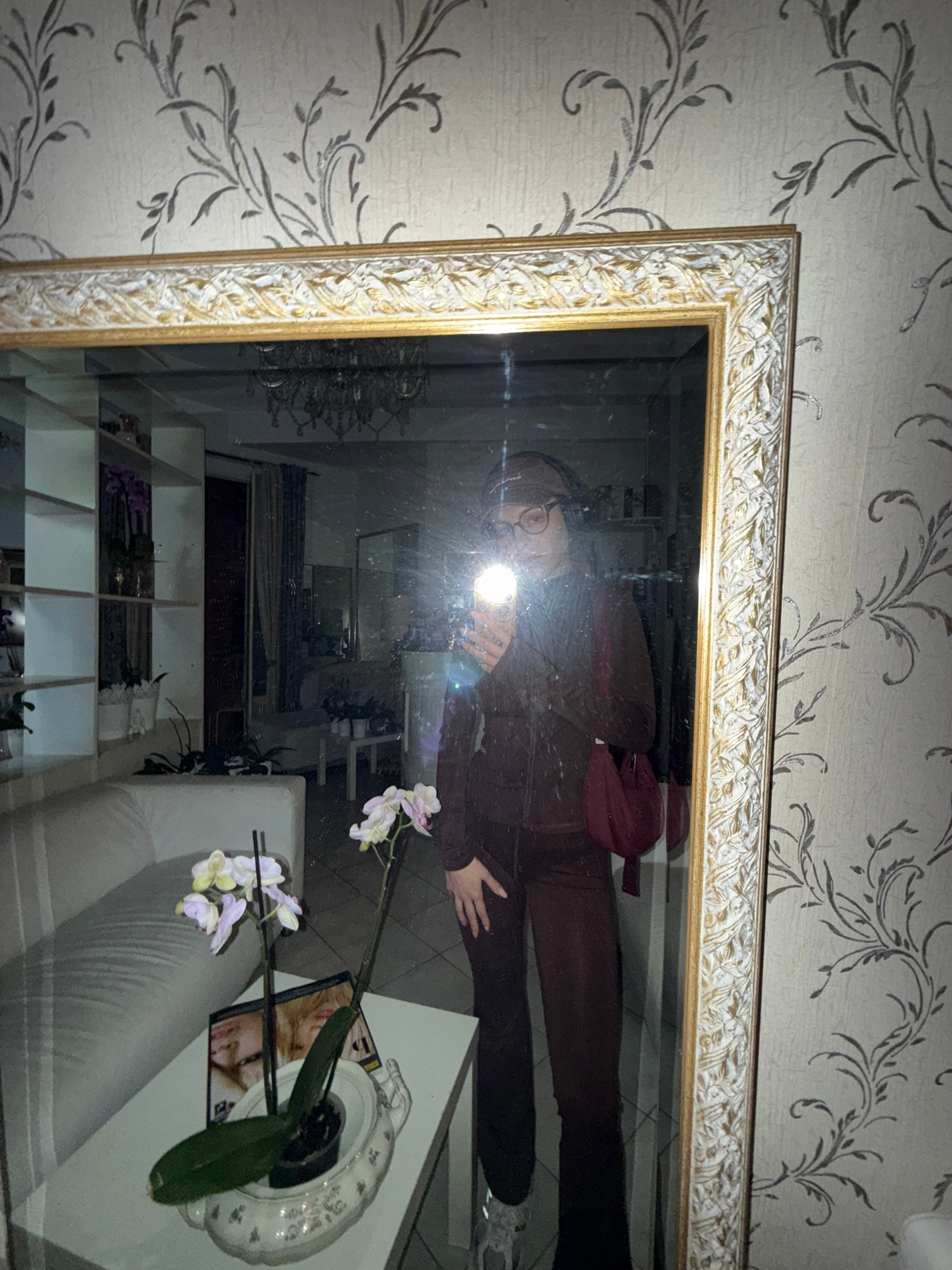 A slightly angled, medium shot captures a reflection in a large, ornate mirror hanging on a wall covered in a light-colored wallpaper with dark, swirling floral patterns. The mirror has a white and go…read more