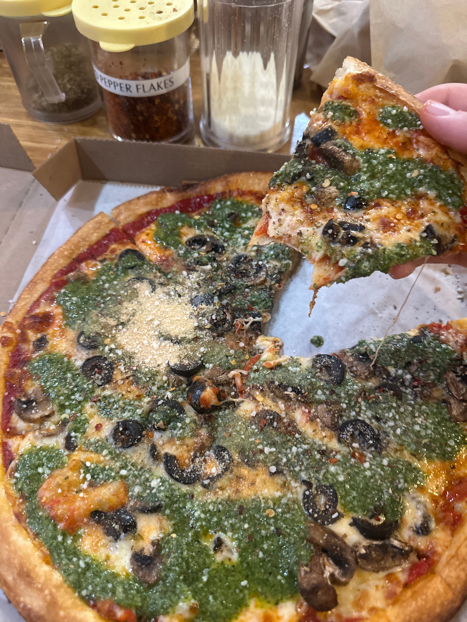 A close-up, high-angle shot captures a partially eaten pizza in what appears to be a casual dining setting in College Park, United States of America. A hand is seen in the upper left, lifting a slice…read more