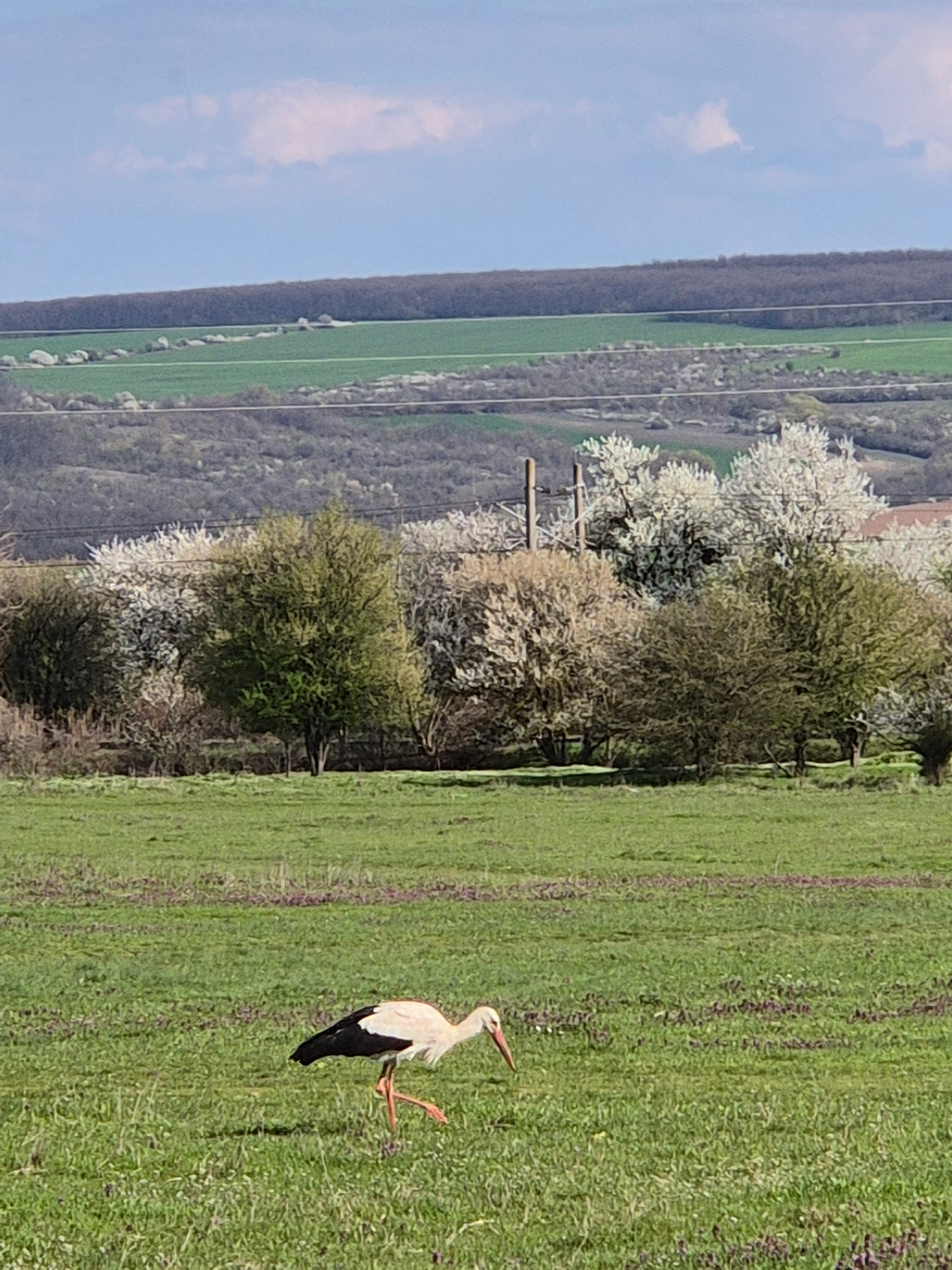The image shows a stork standing in a green field with patches of purple flowers. In the background, there are trees, a hill, and a blue sky with clouds. The location is Медовина, Bulgaria.