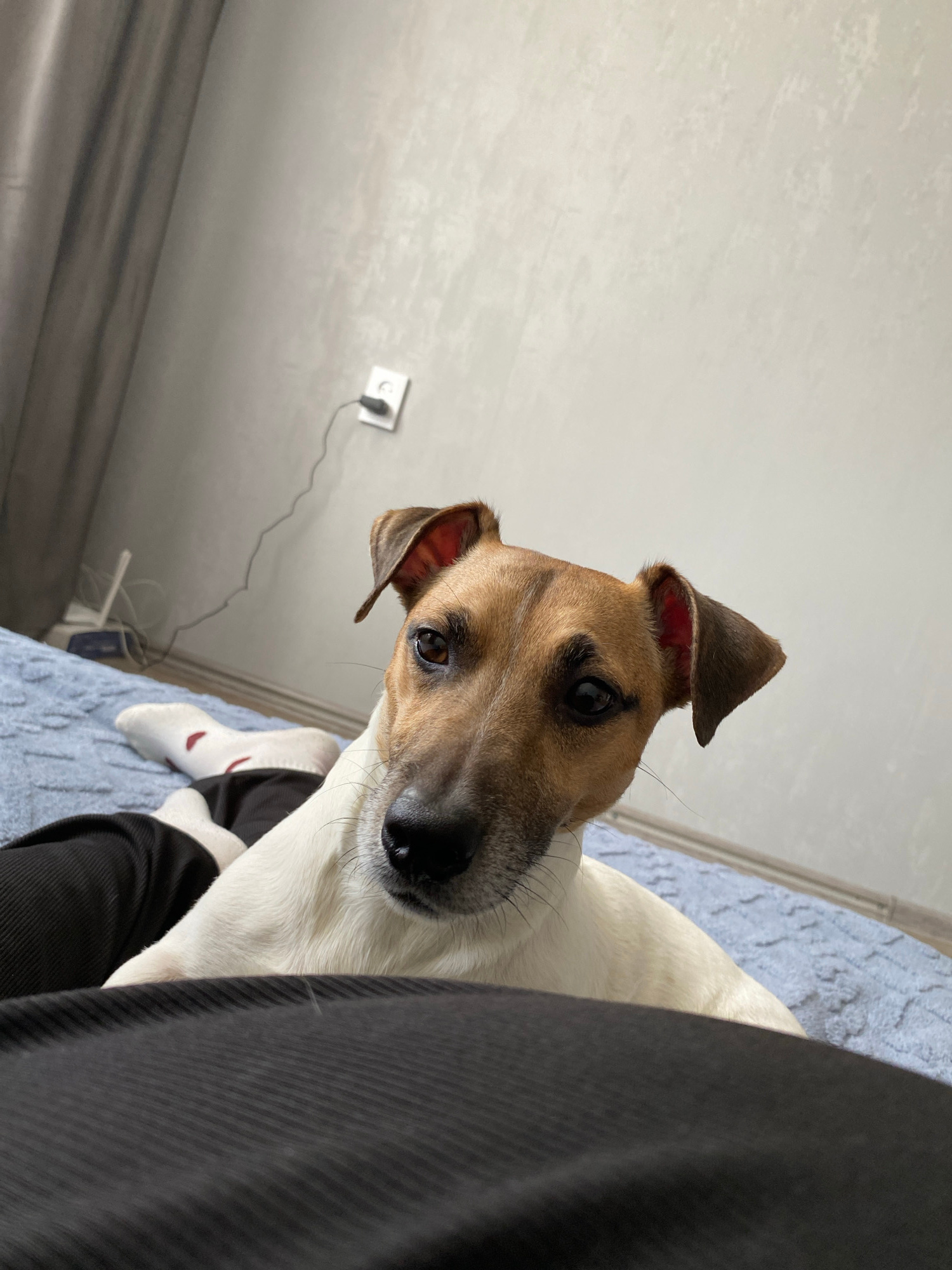 A close-up, low-angle shot features a brown and white dog staring into the camera. The dog is positioned to the left, with part of the right side obscured by a person's leg clad in black trousers. A l…read more