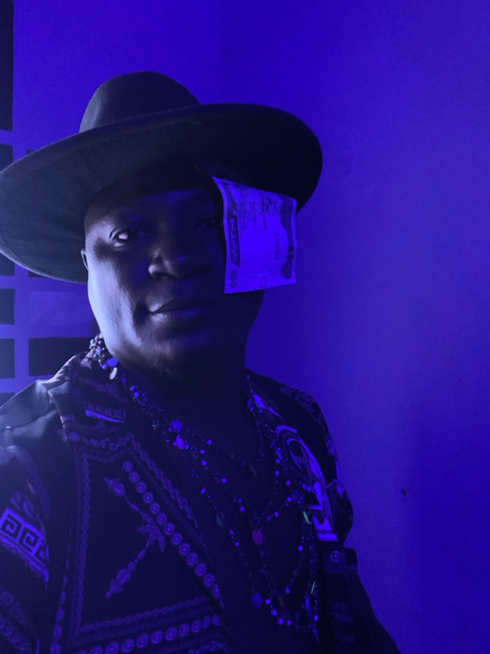 A person wearing a large hat has a 500 Nigerian naira note resting on their forehead, partially obscuring their face. The individual is dressed in a dark patterned shirt with jewelry visible around th…read more