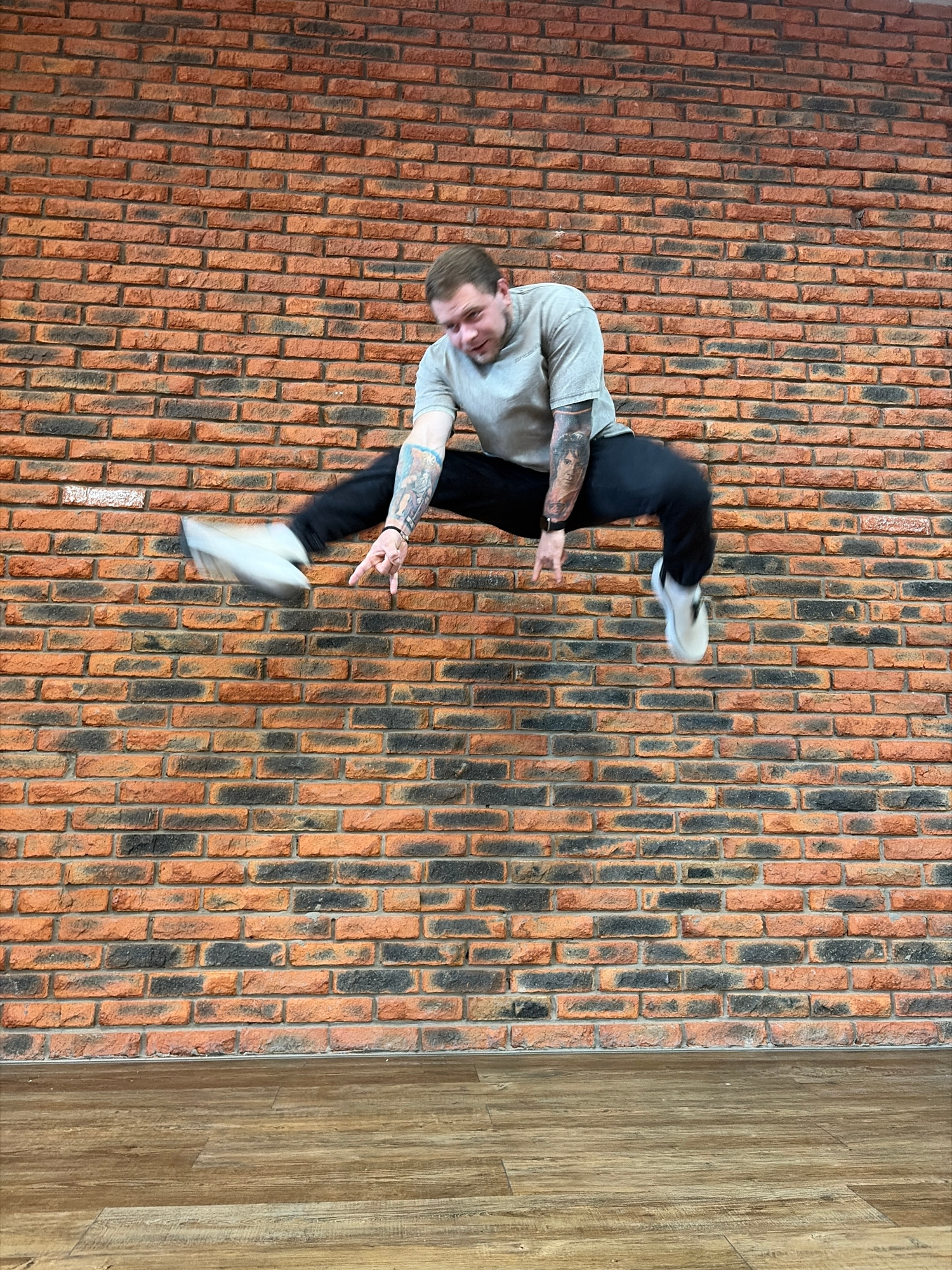The image displays a dynamic indoor scene in Chaikovsky, Russia, featuring a man in mid-air against a textured background. The primary subject is a man, dressed in a light grey t-shirt, dark pants, an…read more