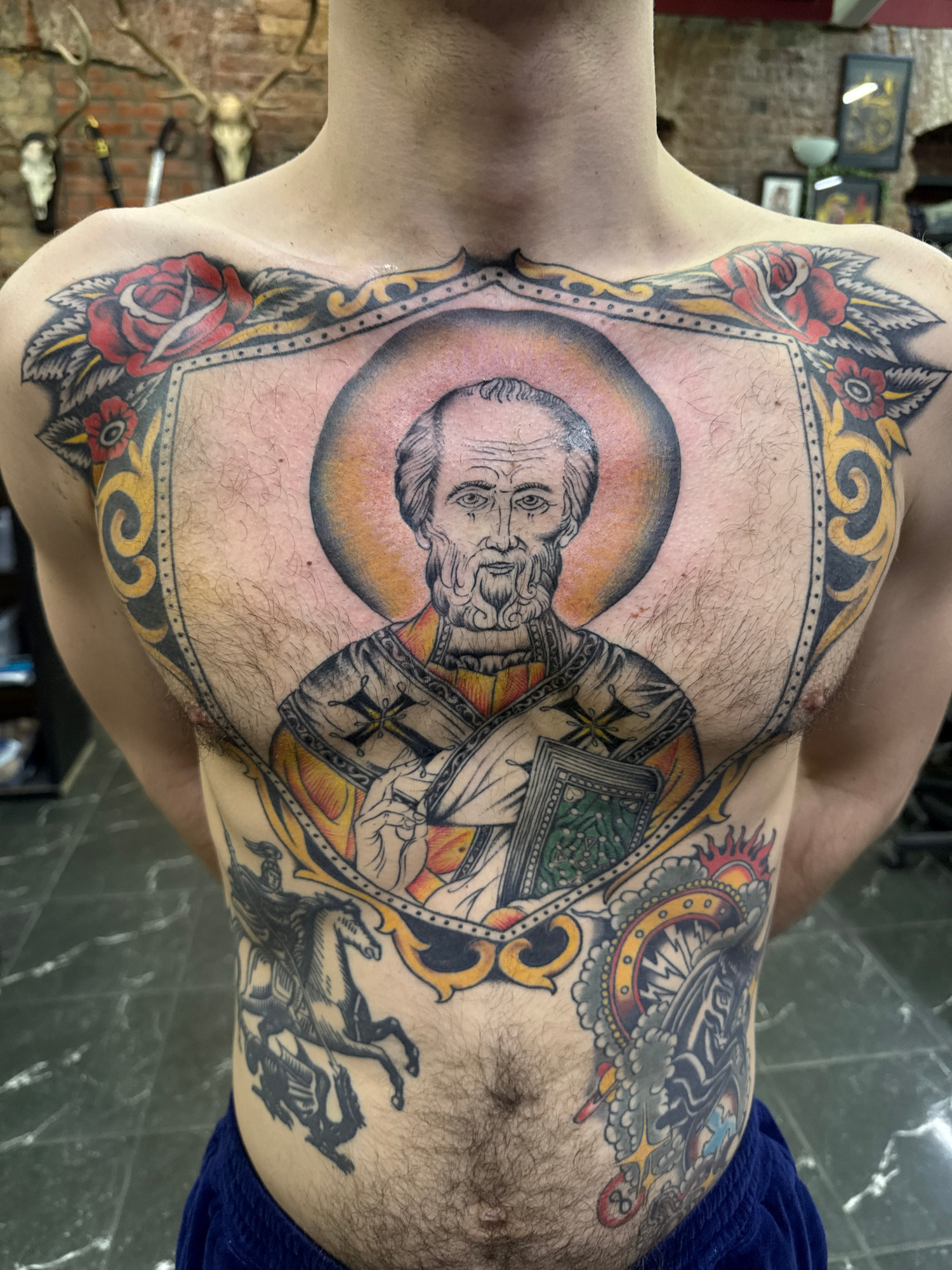 A man's torso is covered in tattoos. The central tattoo is of a saintly figure with a halo, framed by an ornate design with roses. To the right, another tattoo depicts a horse and rider, and a complex…read more