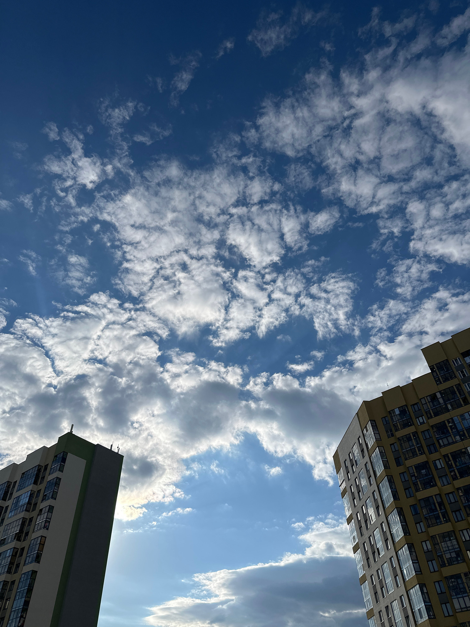The image presents an upward-angled view of a dynamic sky framed by two modern buildings, typical of an urban environment in Yekaterinburg, Russia. The dominant feature is the blue sky, largely covereβ¦read more