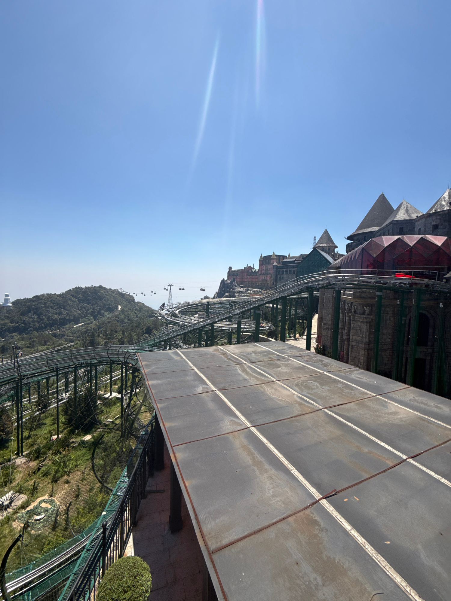 The image captures a scene at Ba Na Hills, a resort area in the city of Đà Nẵng, Vietnam. The perspective is elevated, possibly from a viewing platform or building. Structures: Architectural elements…read more