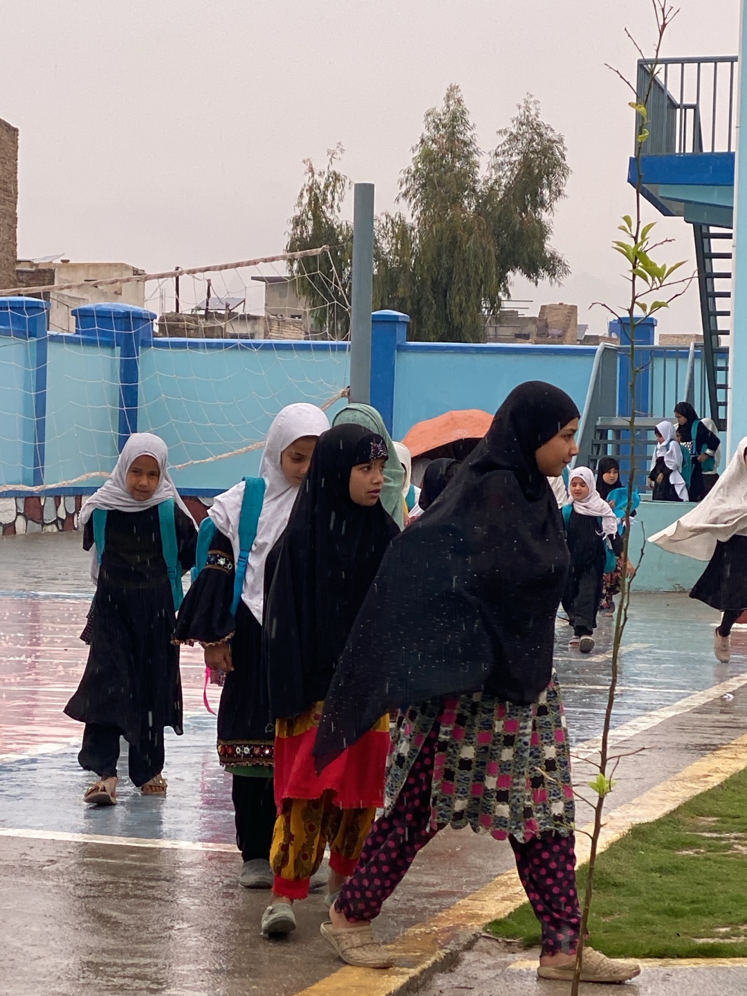 In Kandahar, Afghanistan, a group of girls, primarily dressed in traditional attire and headscarves, are walking on a wet paved surface, likely a schoolyard, during what appears to be a rainy day. The…read more