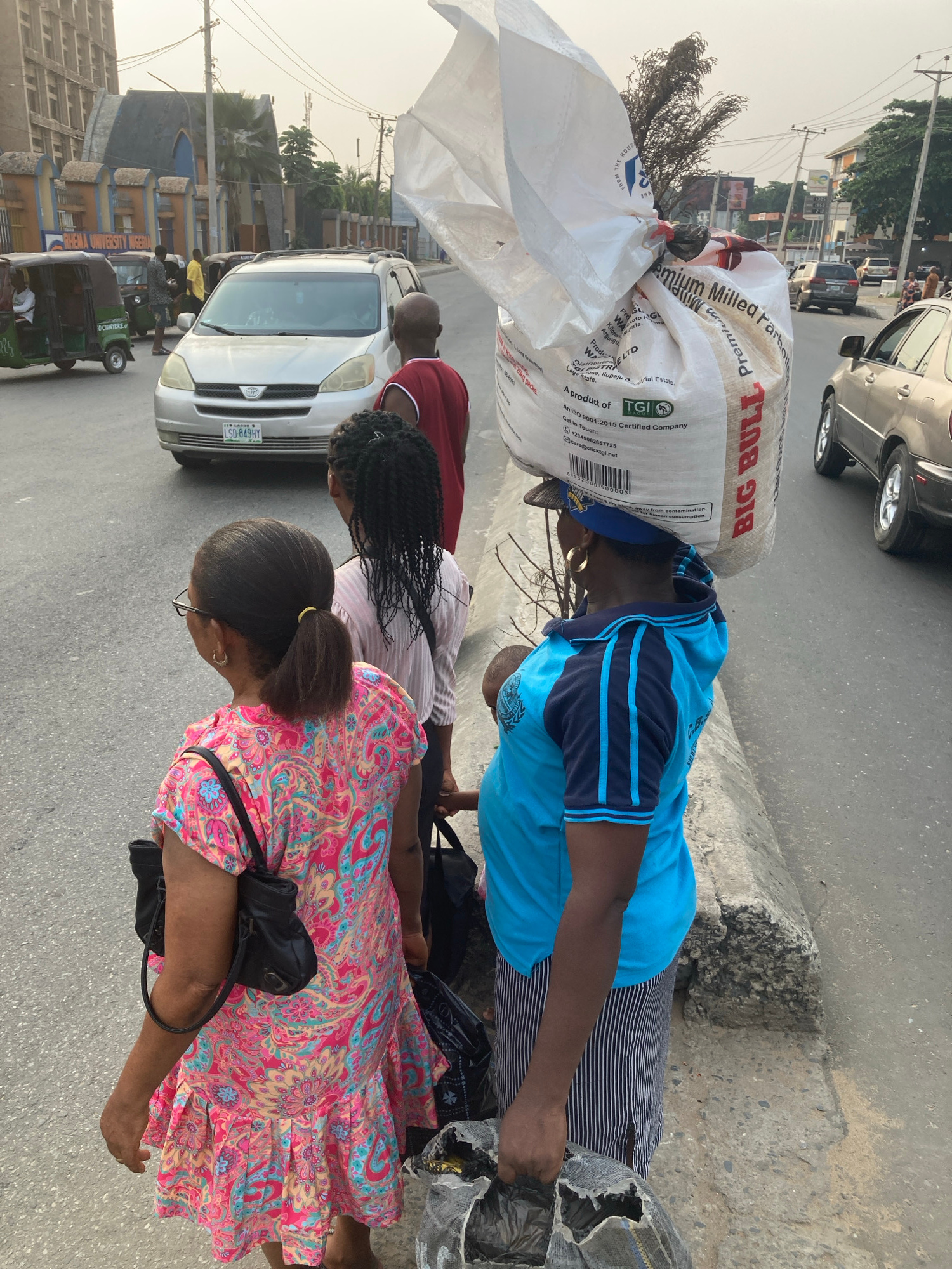 The image depicts a street scene, likely in Aba, Nigeria, given the vehicle license plate marked "Abia" and the architecture of the buildings in the background. A person is carrying a large sack label…read more